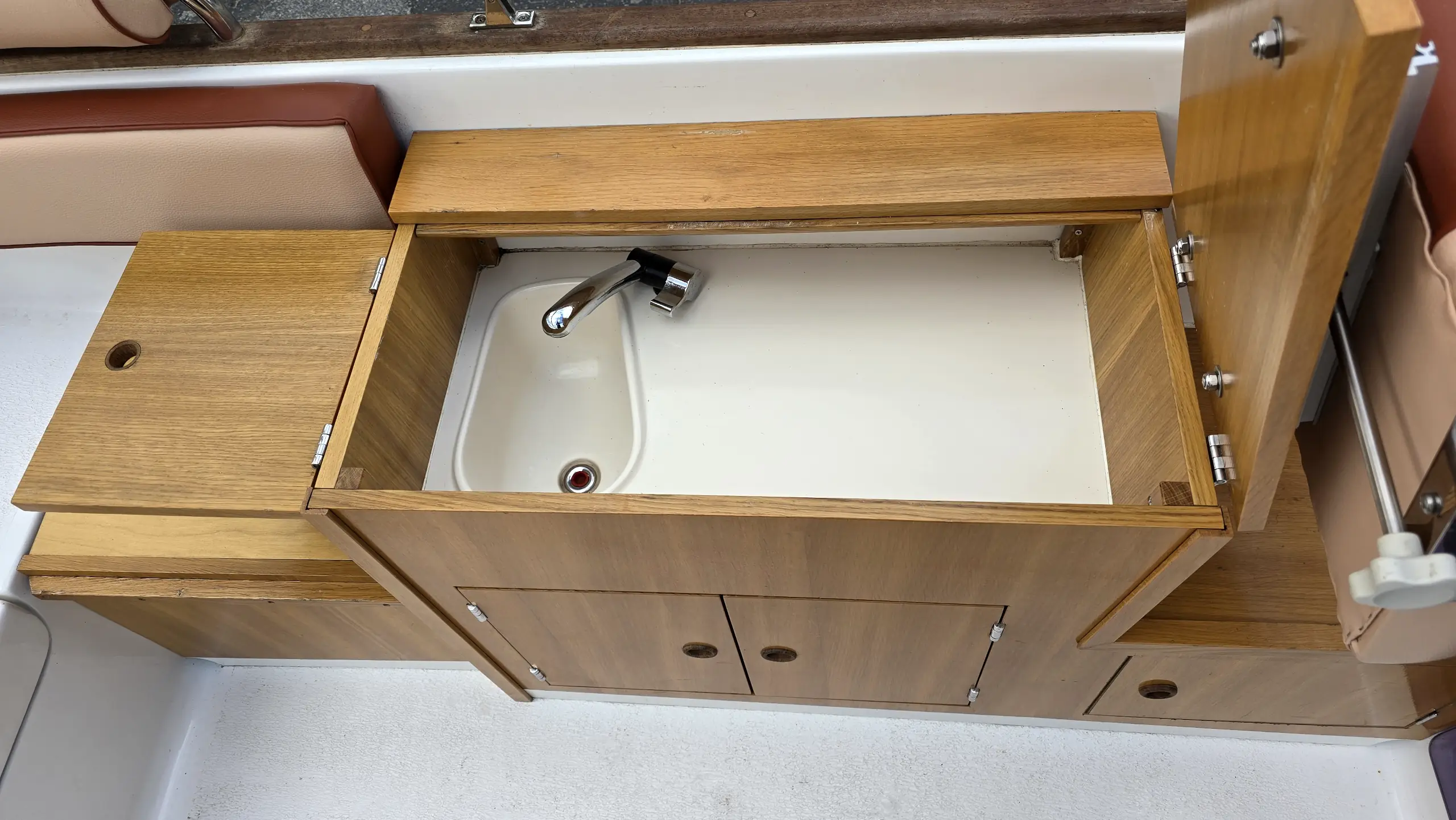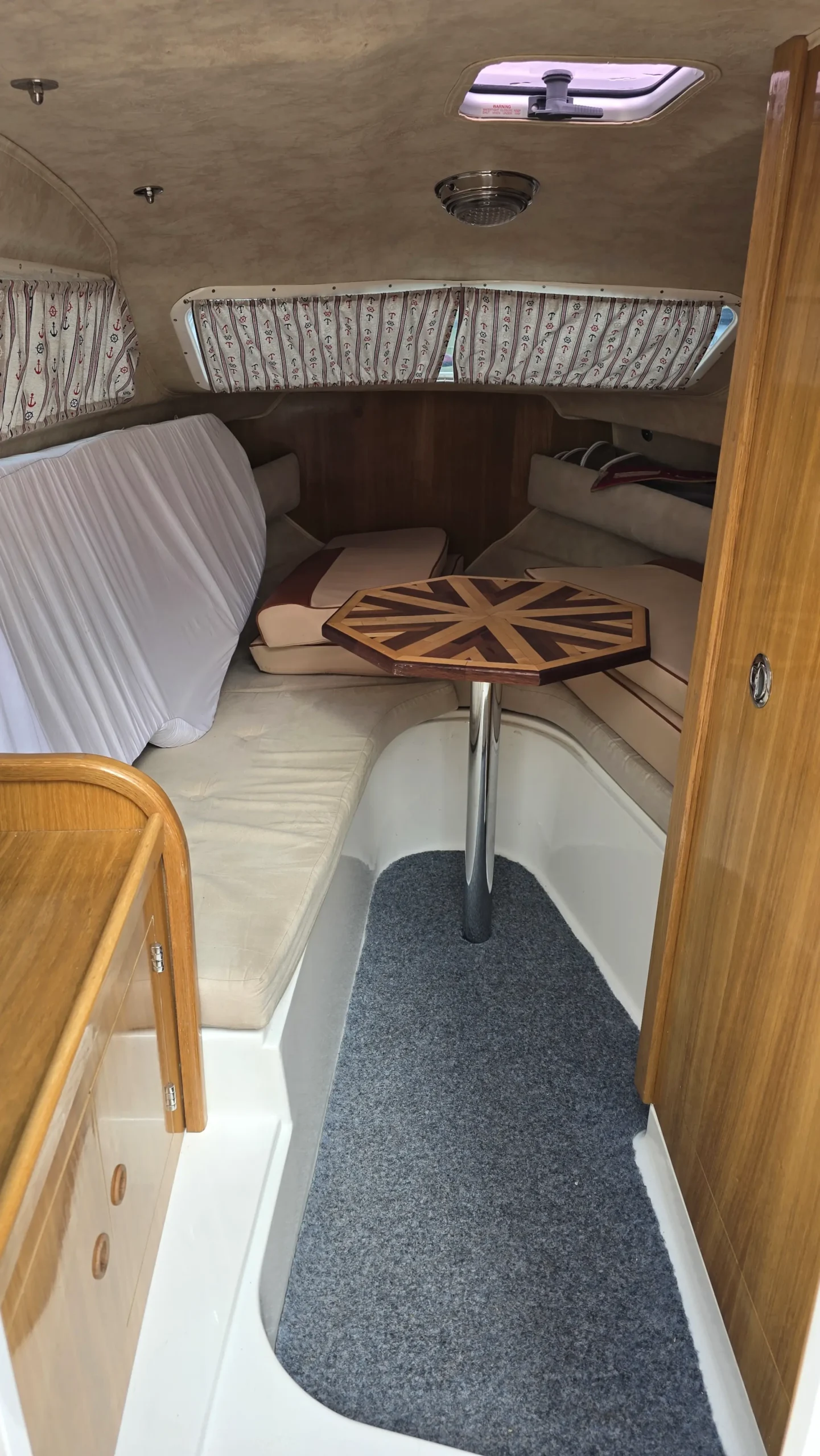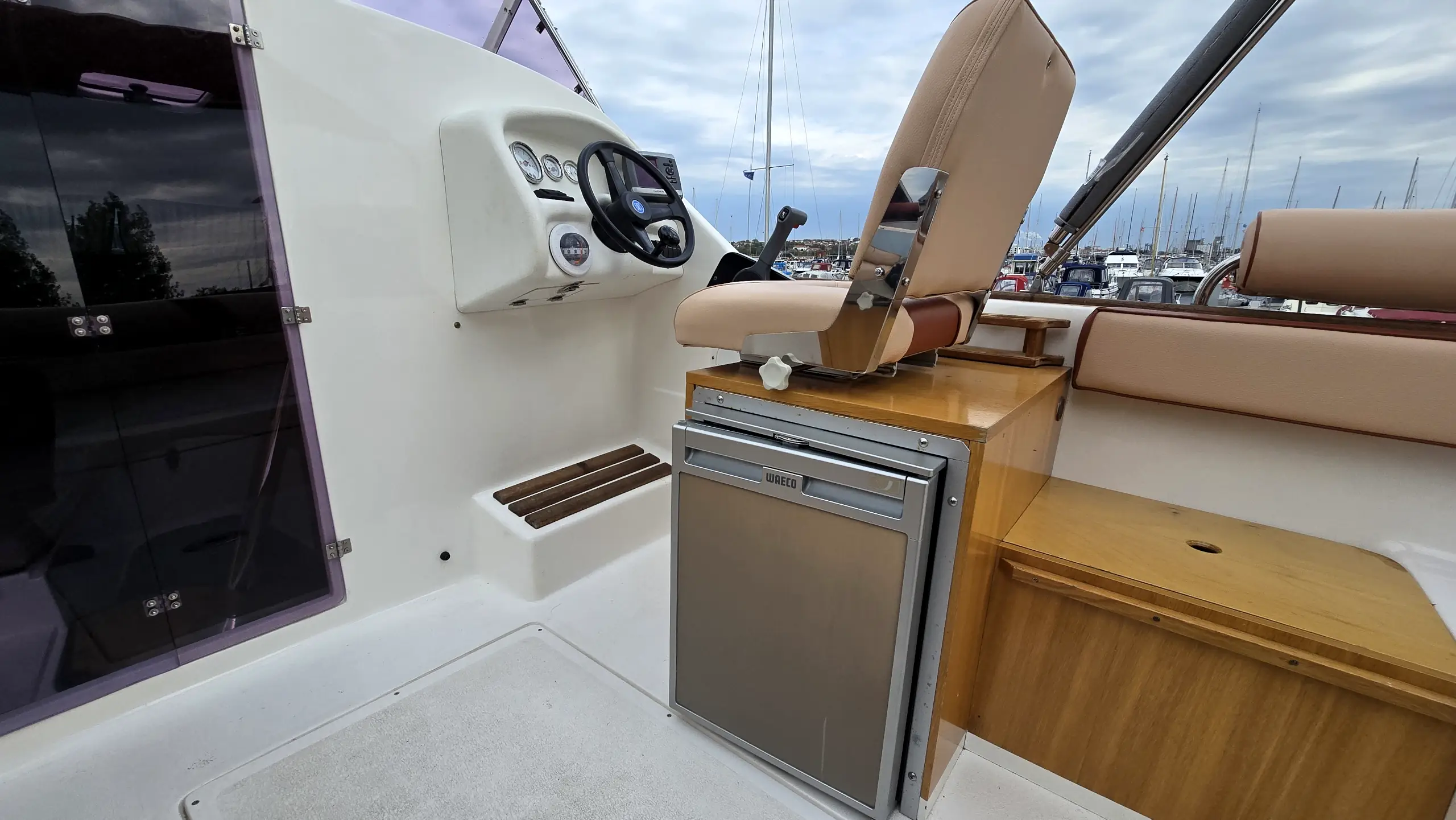 Når du træder ned i kabinen på denne Aqualine 640, bliver du overrasket over den høje grad af komfort. Det er en klassisk kabinebåd, men med udstyr man normalt kun finder i større skibe. Kabinen byder på en lys atmosfære og er praktisk indrettet med: