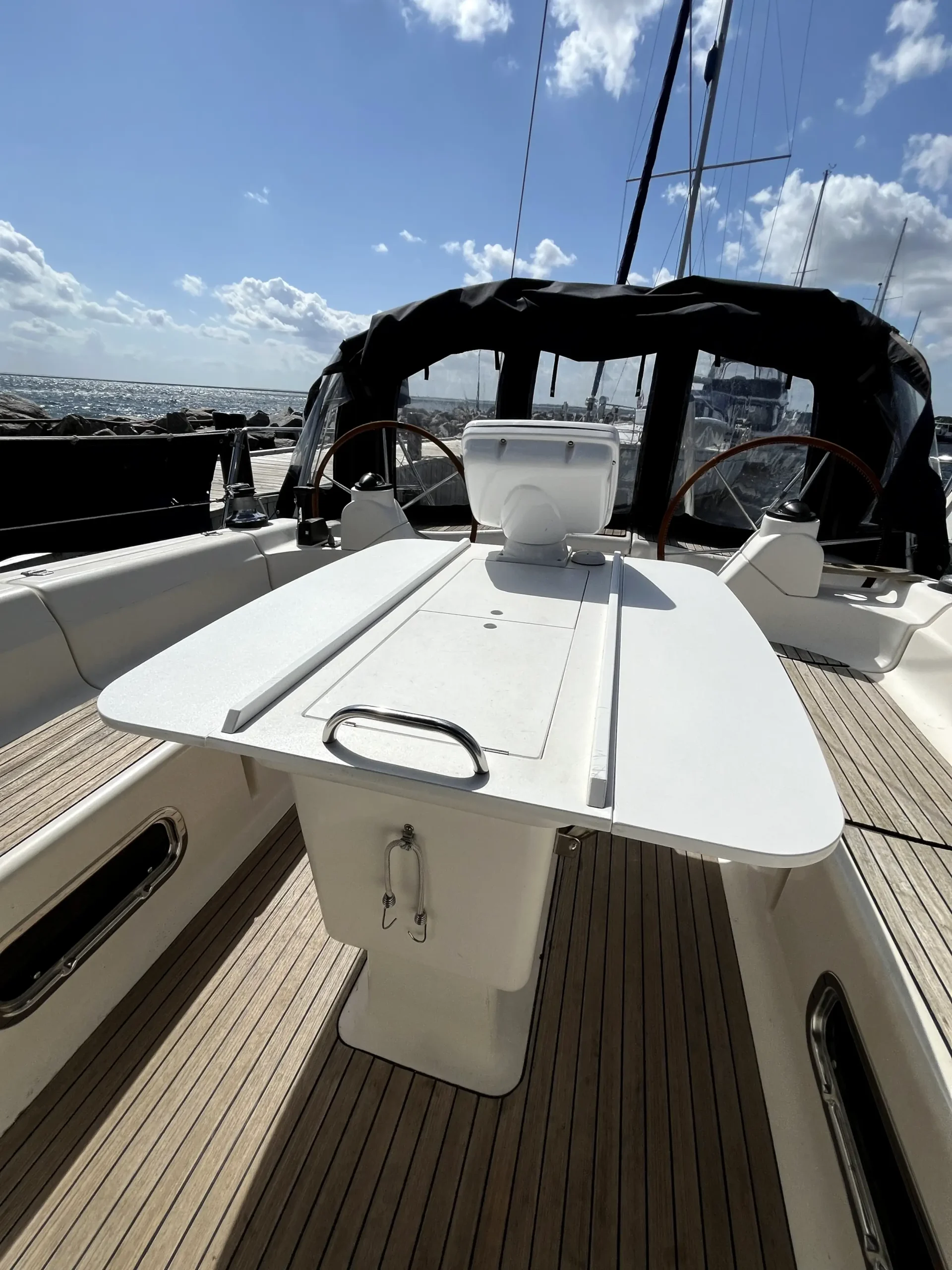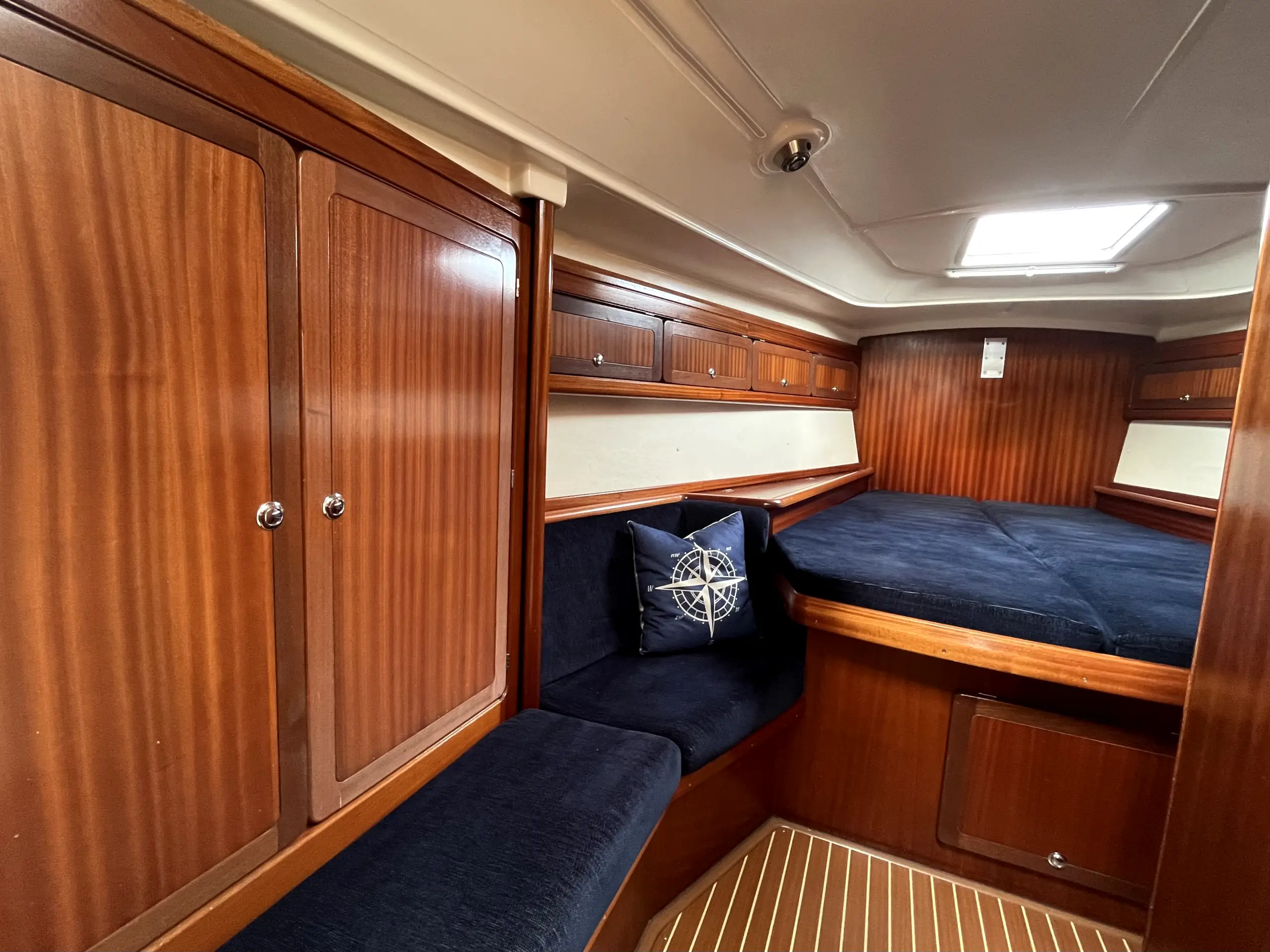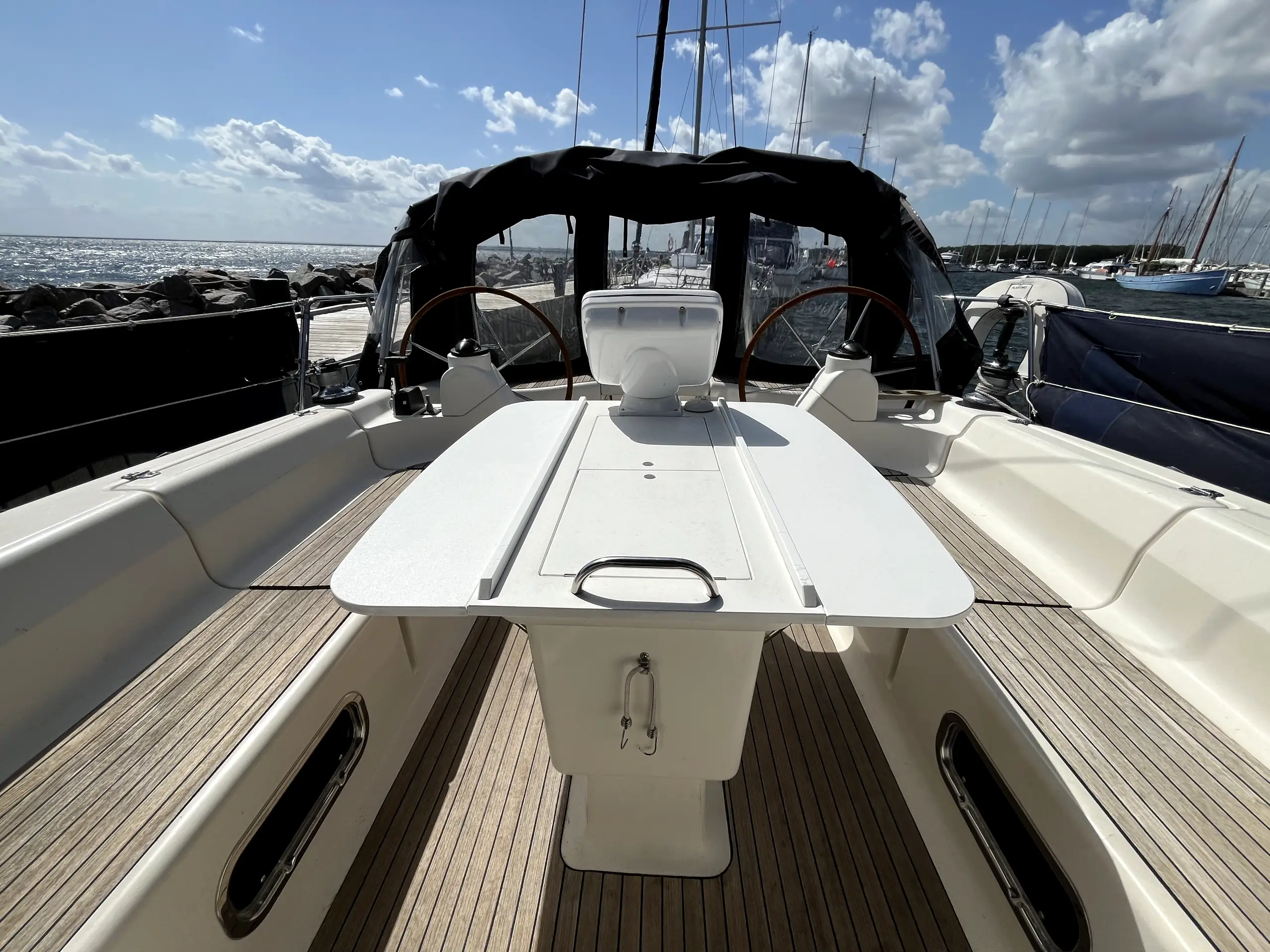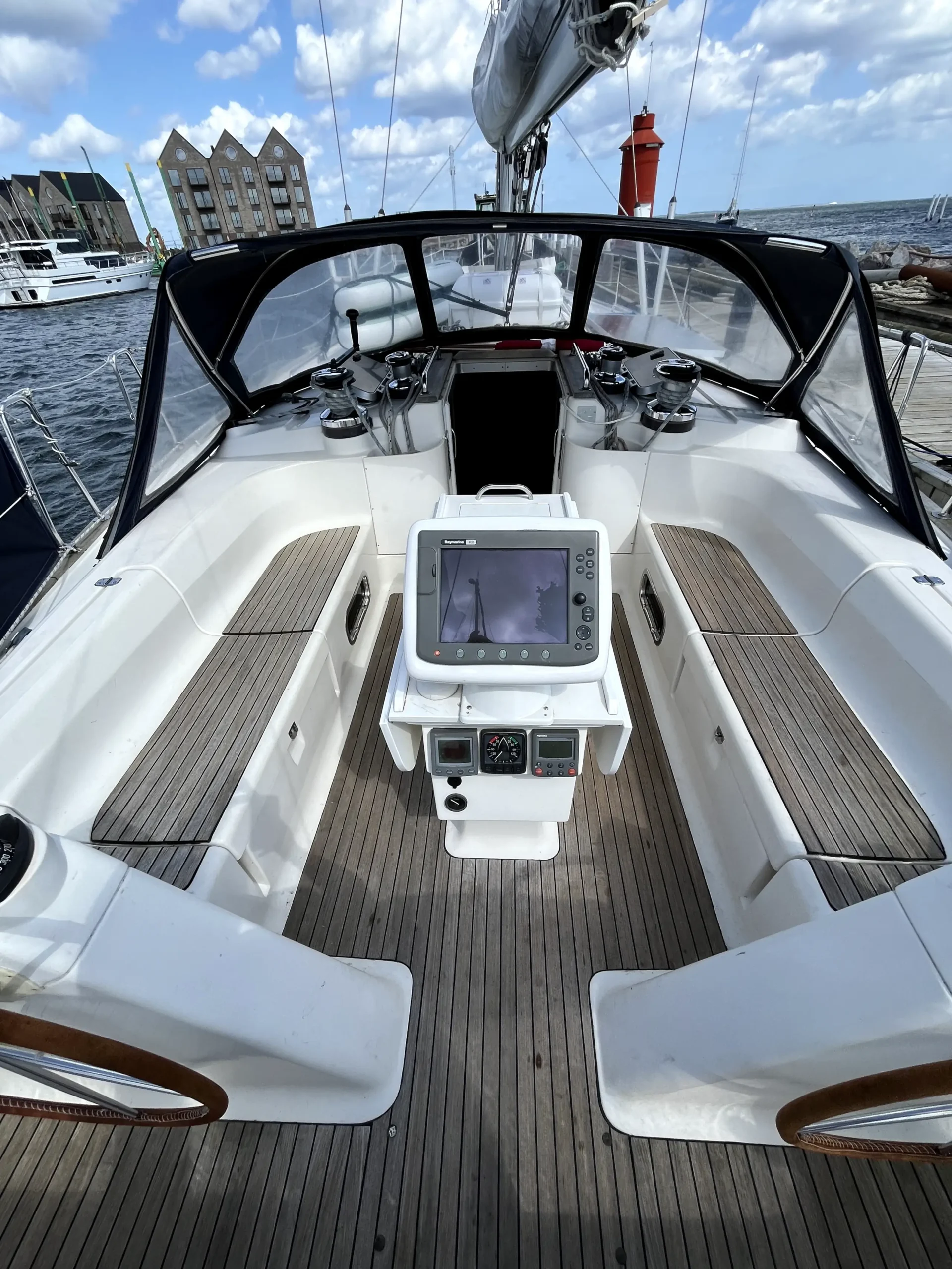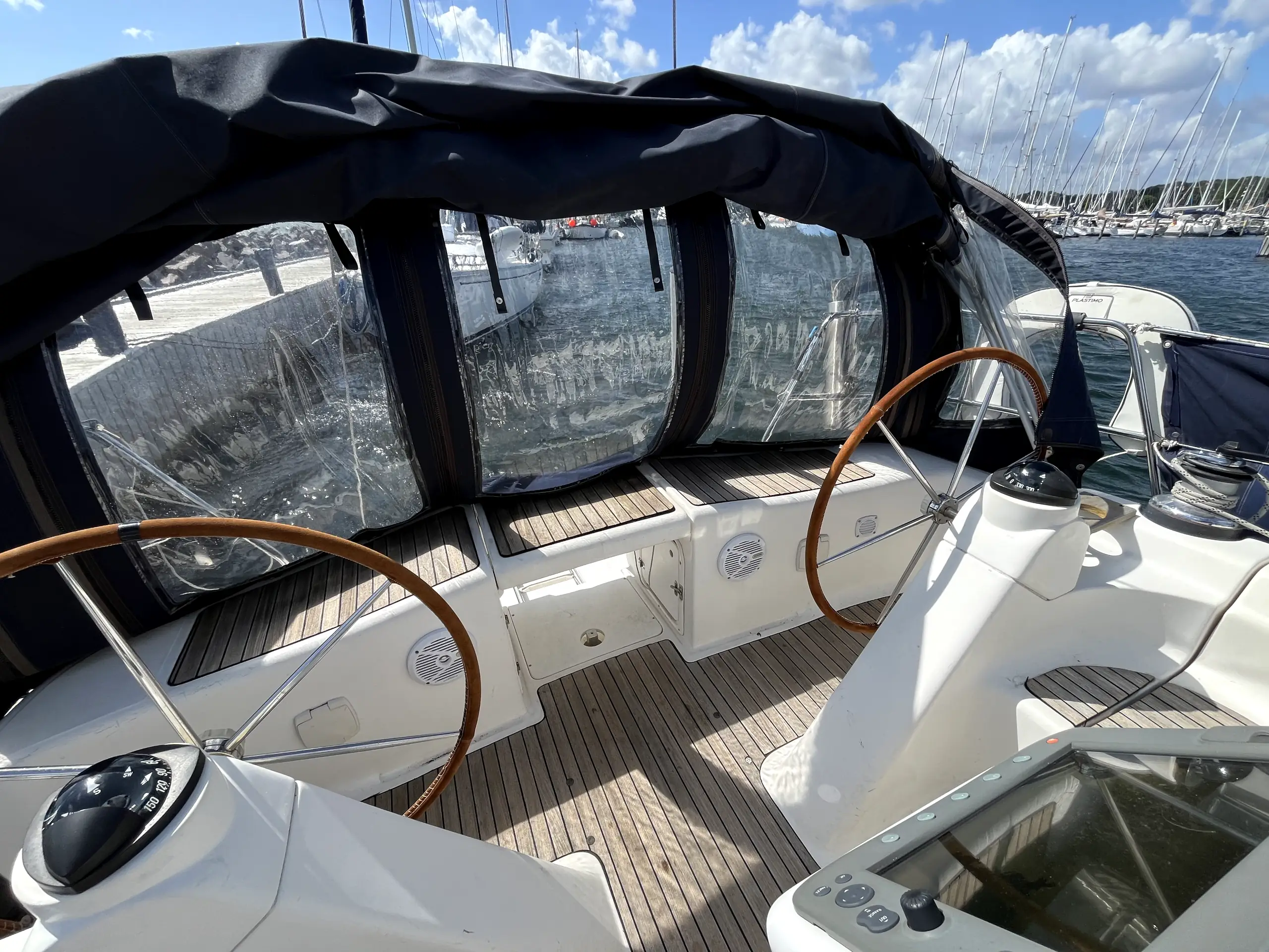 I cockpittet er der god plads til hele besætningen. Det faste cockpitbord og det fulde cockpittelt det til et naturligt samlingspunkt både under sejlads og i havn – i al slags vejr. Båden er let at håndtere, også for mindre besætninger, takket være rulleforsejl og Lazy-Jack systemet til storsejlet, som gør sejlmanøvrer enkle og sikre. En kraftig Volvo Penta-motor sørger for driftssikker fremdrift, og båden er udstyret med autopilot, kortplotter, vindinstrumenter, elektrisk ankerspil samt bovpropel – alt, hvad man har brug for til ubekymret sejlads.