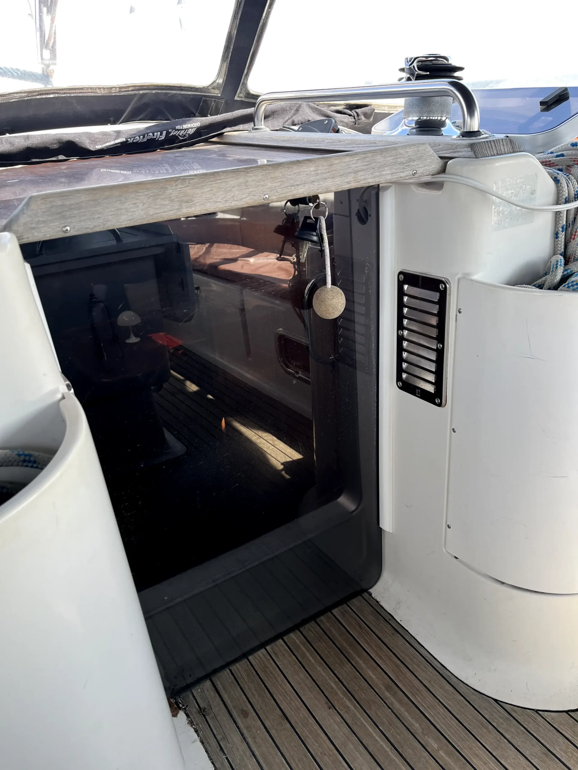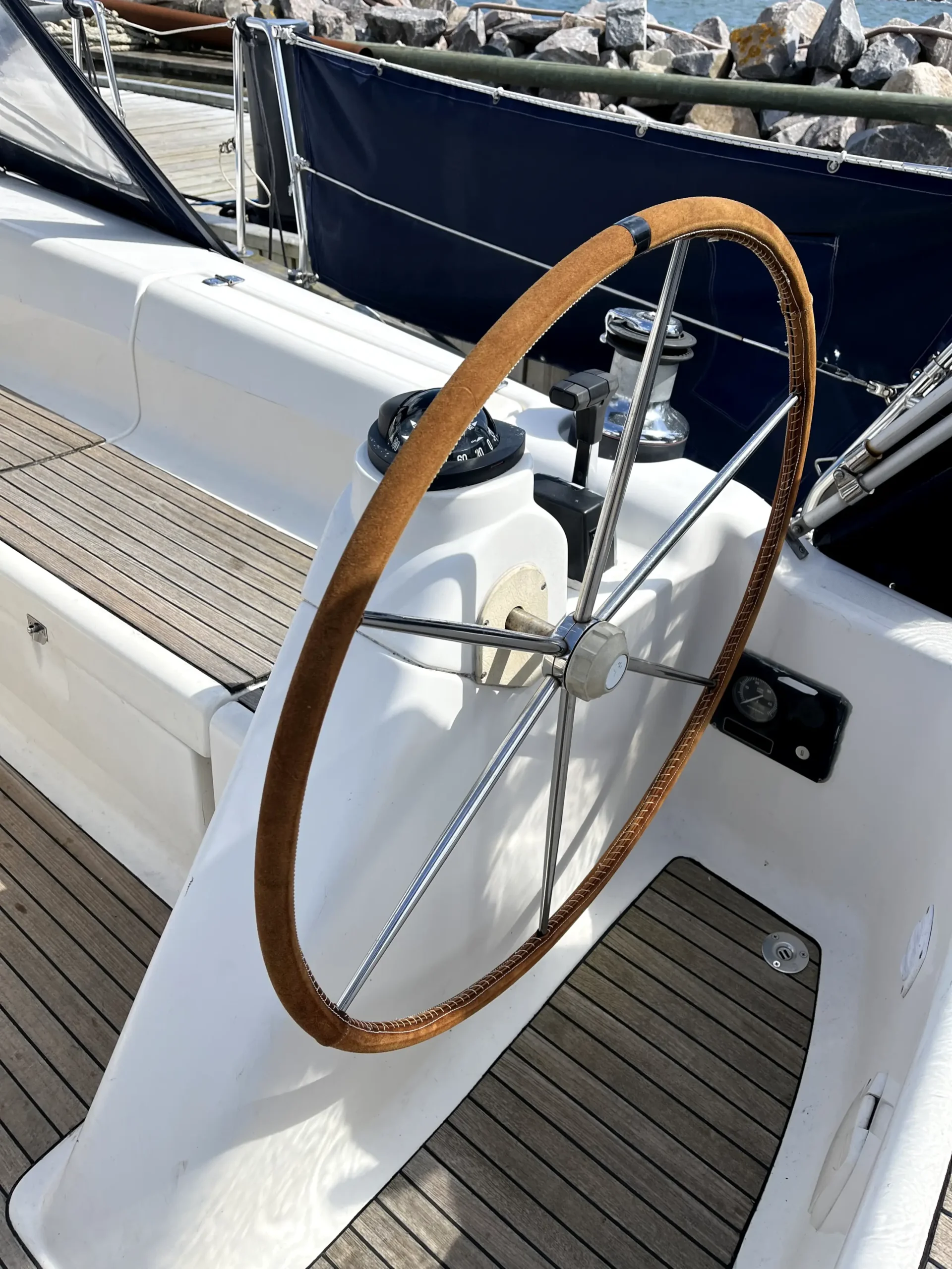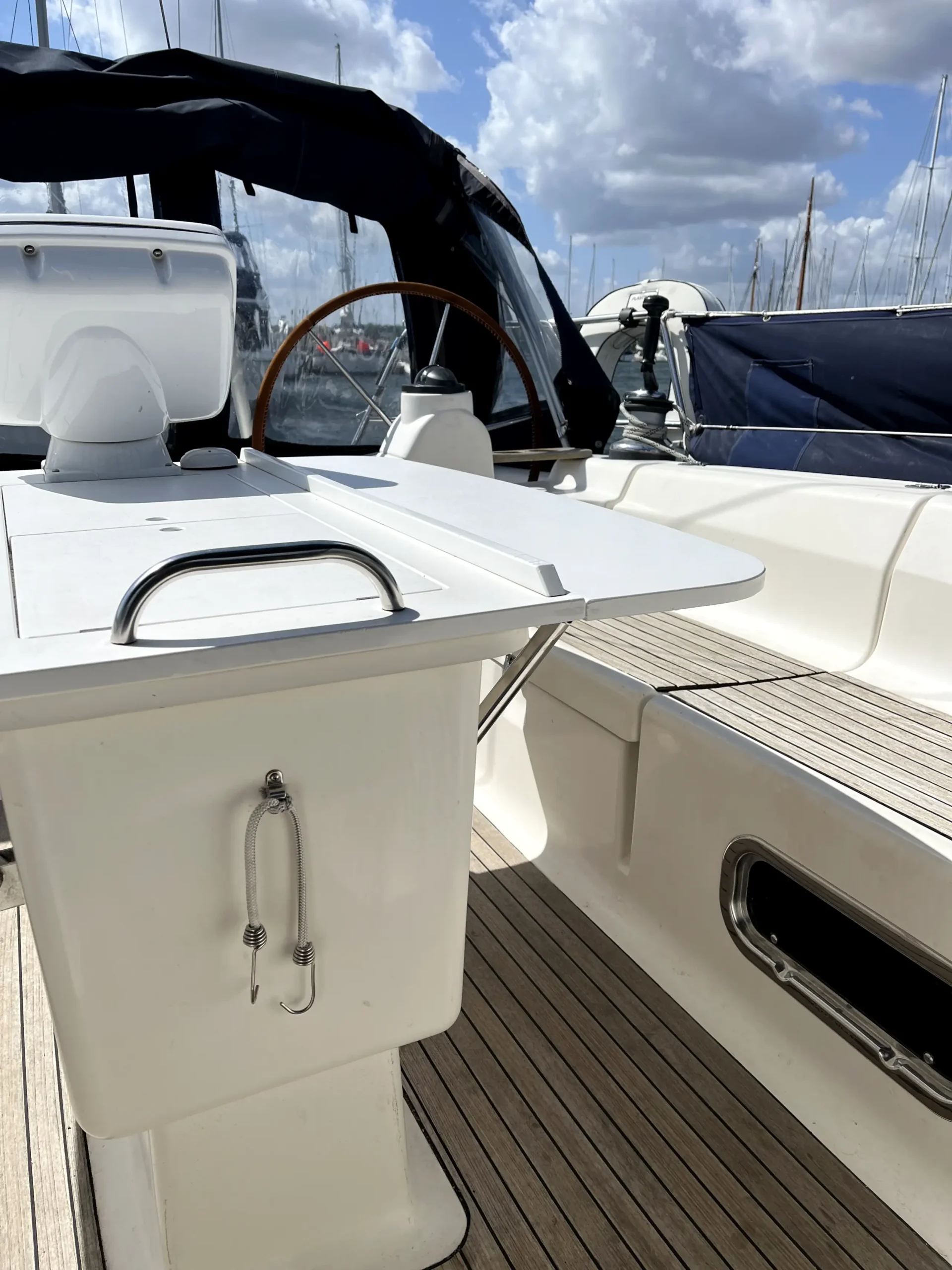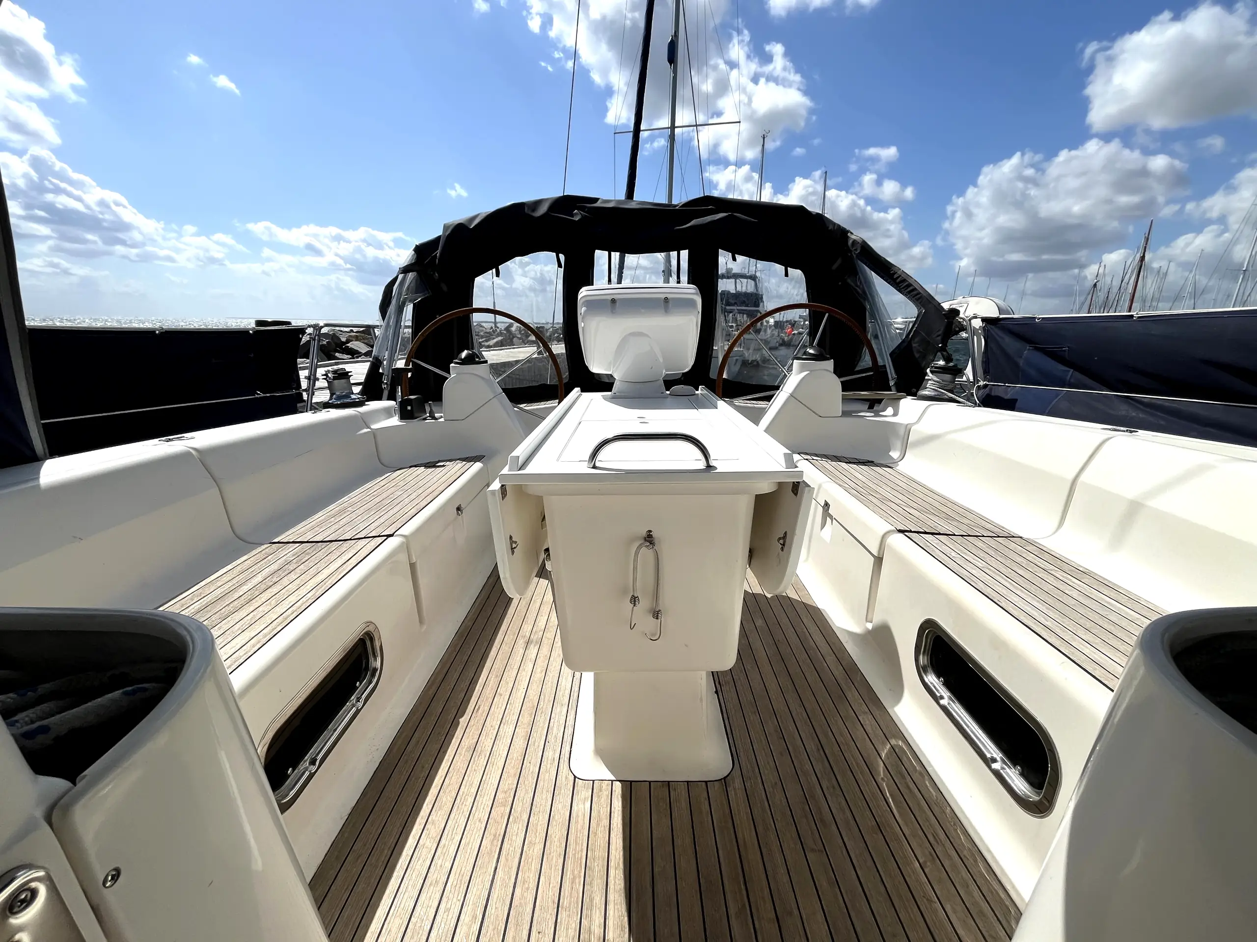 I cockpittet er der god plads til hele besætningen. Det faste cockpitbord og det fulde cockpittelt det til et naturligt samlingspunkt både under sejlads og i havn – i al slags vejr. Båden er let at håndtere, også for mindre besætninger, takket være rulleforsejl og Lazy-Jack systemet til storsejlet, som gør sejlmanøvrer enkle og sikre. En kraftig Volvo Penta-motor sørger for driftssikker fremdrift, og båden er udstyret med autopilot, kortplotter, vindinstrumenter, elektrisk ankerspil samt bovpropel – alt, hvad man har brug for til ubekymret sejlads.