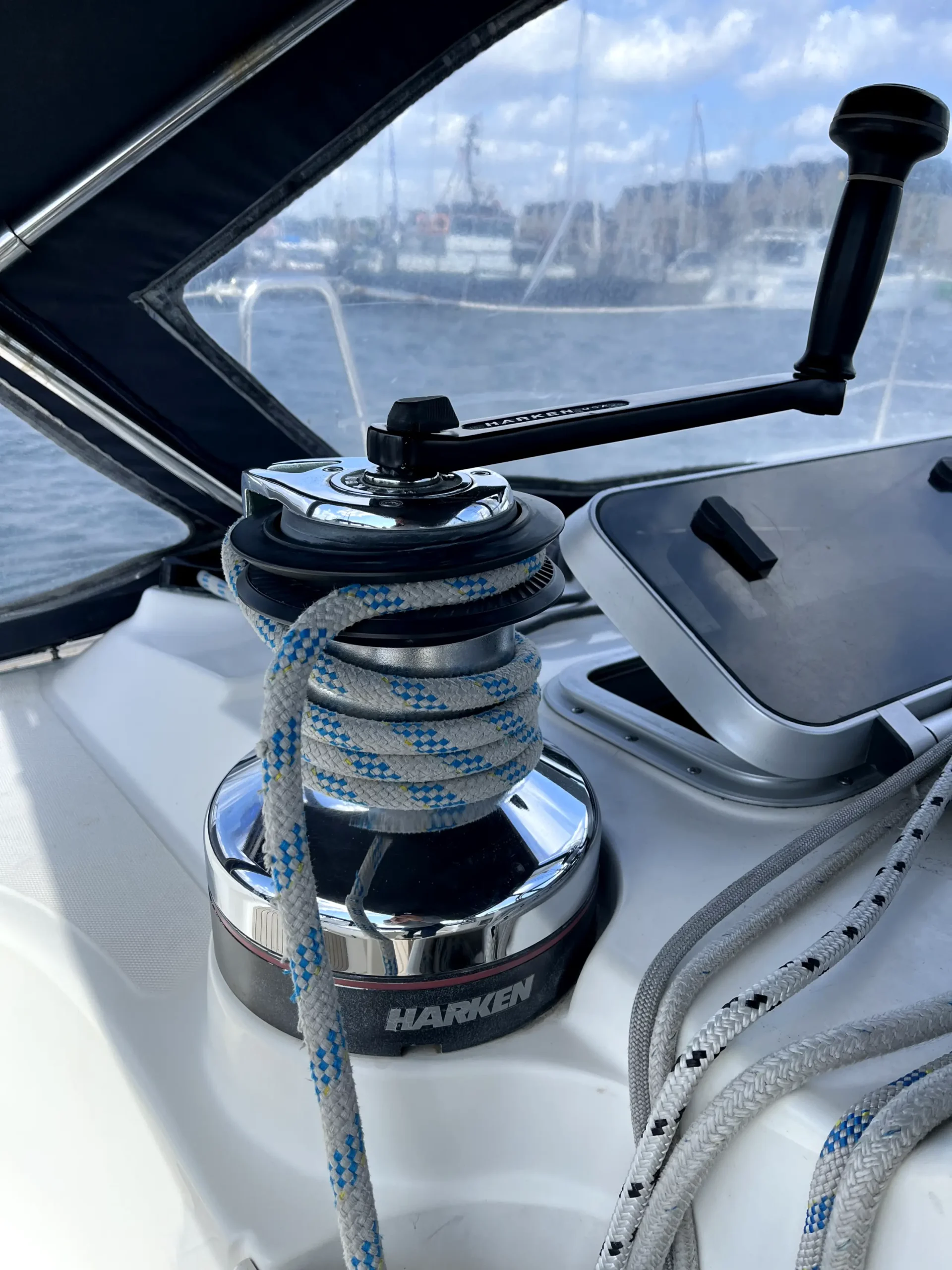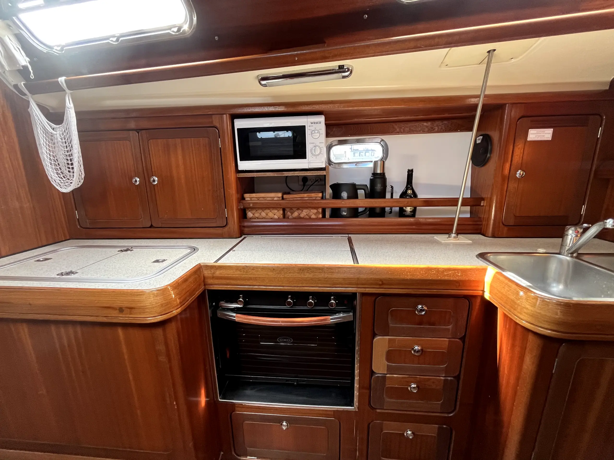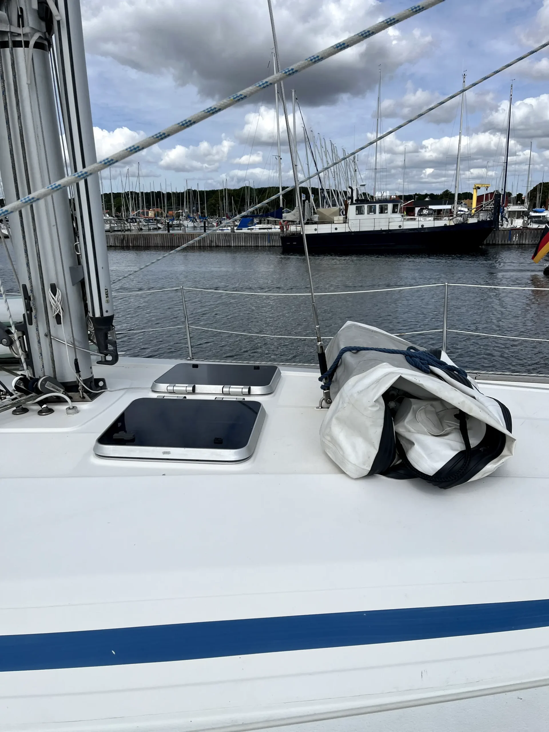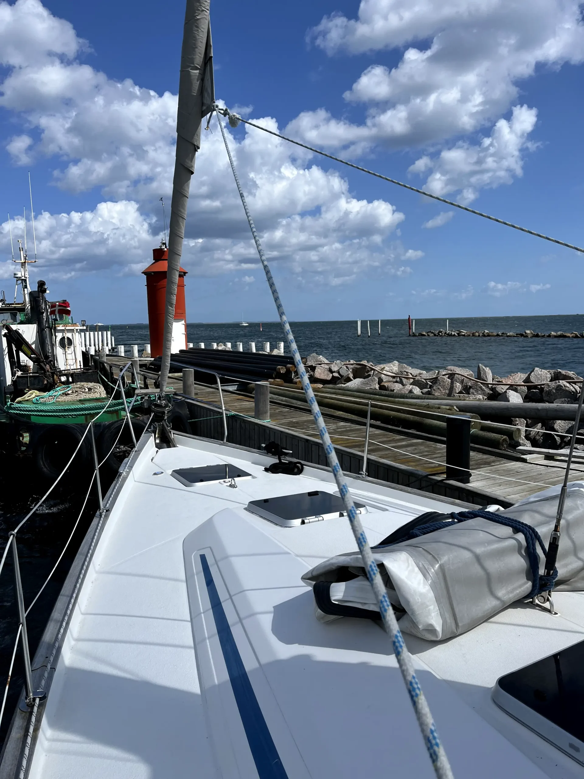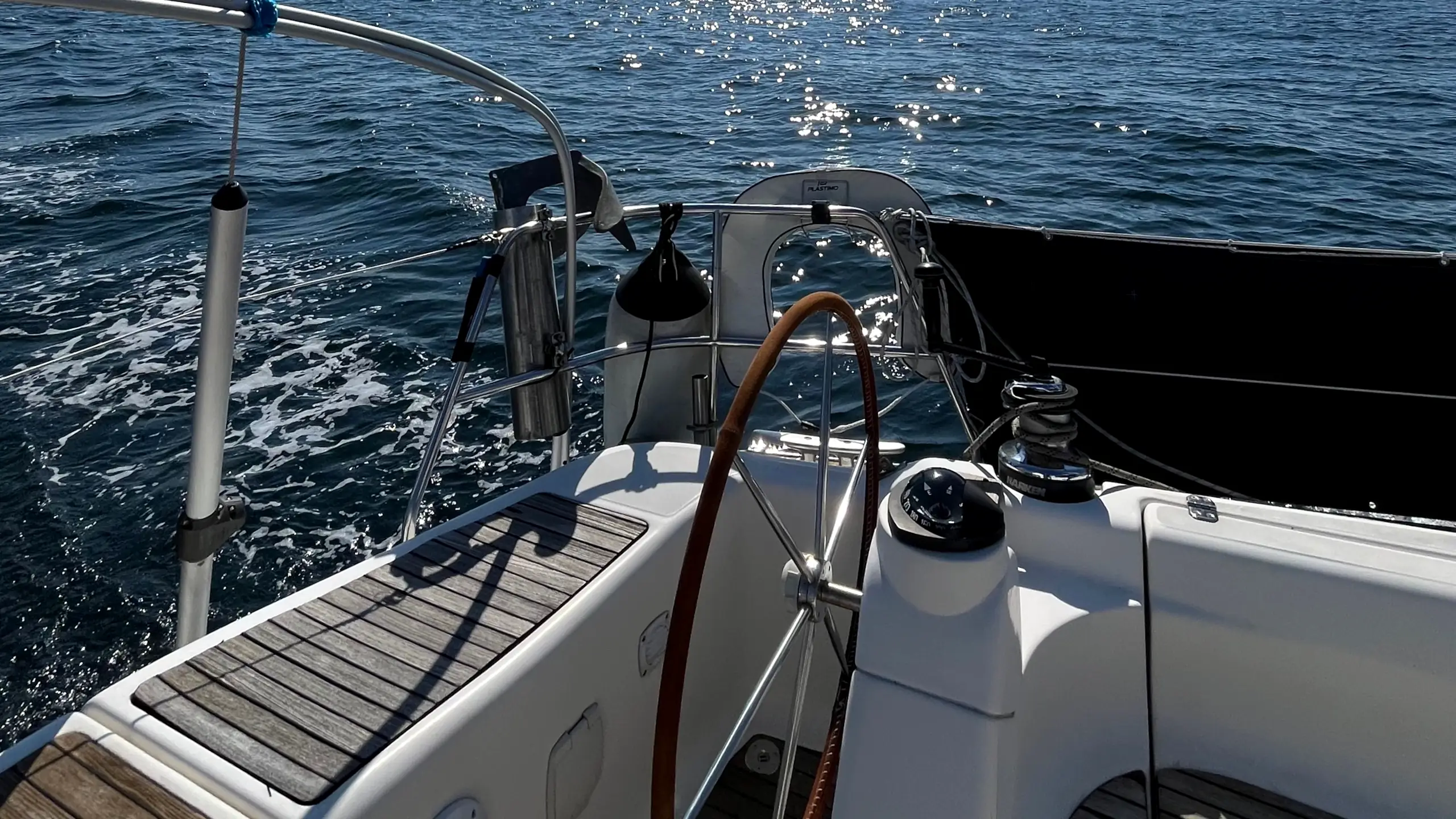 I cockpittet er der god plads til hele besætningen. Det faste cockpitbord og det fulde cockpittelt det til et naturligt samlingspunkt både under sejlads og i havn – i al slags vejr. Båden er let at håndtere, også for mindre besætninger, takket være rulleforsejl og Lazy-Jack systemet til storsejlet, som gør sejlmanøvrer enkle og sikre. En kraftig Volvo Penta-motor sørger for driftssikker fremdrift, og båden er udstyret med autopilot, kortplotter, vindinstrumenter, elektrisk ankerspil samt bovpropel – alt, hvad man har brug for til ubekymret sejlads.
