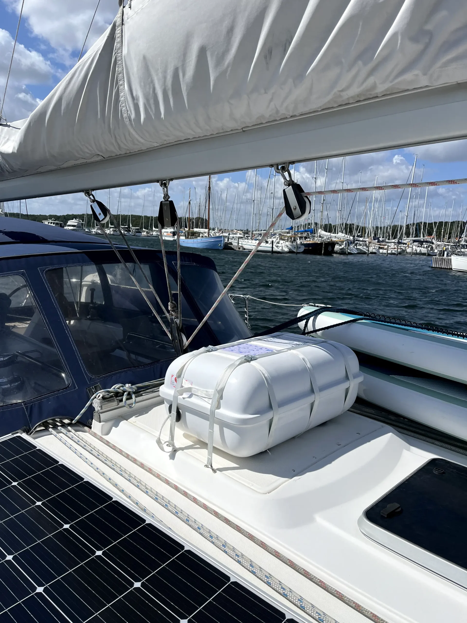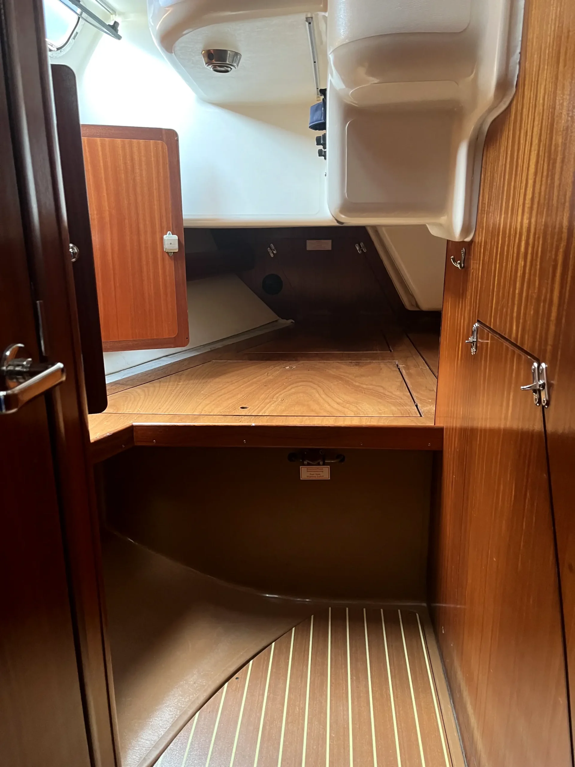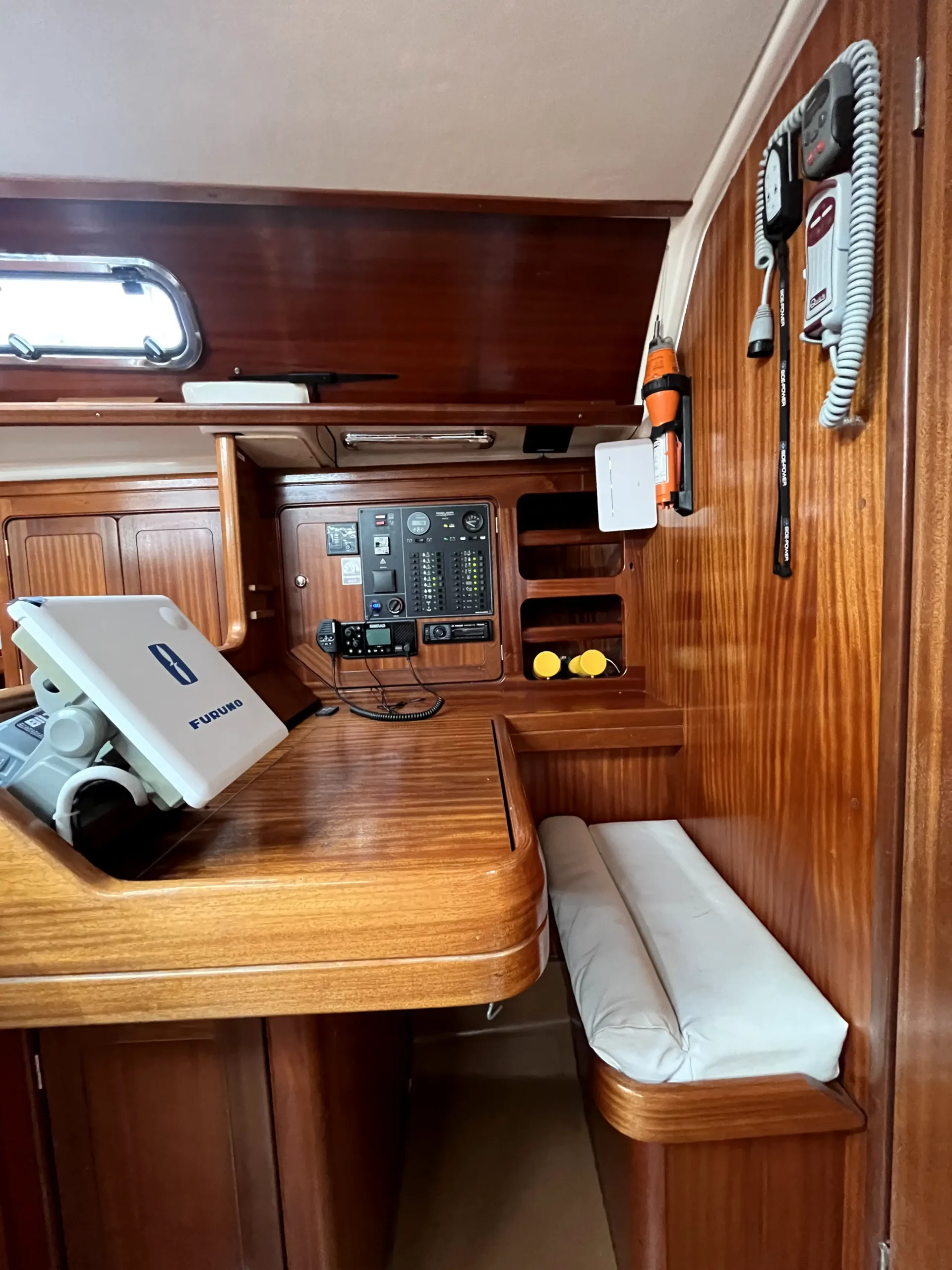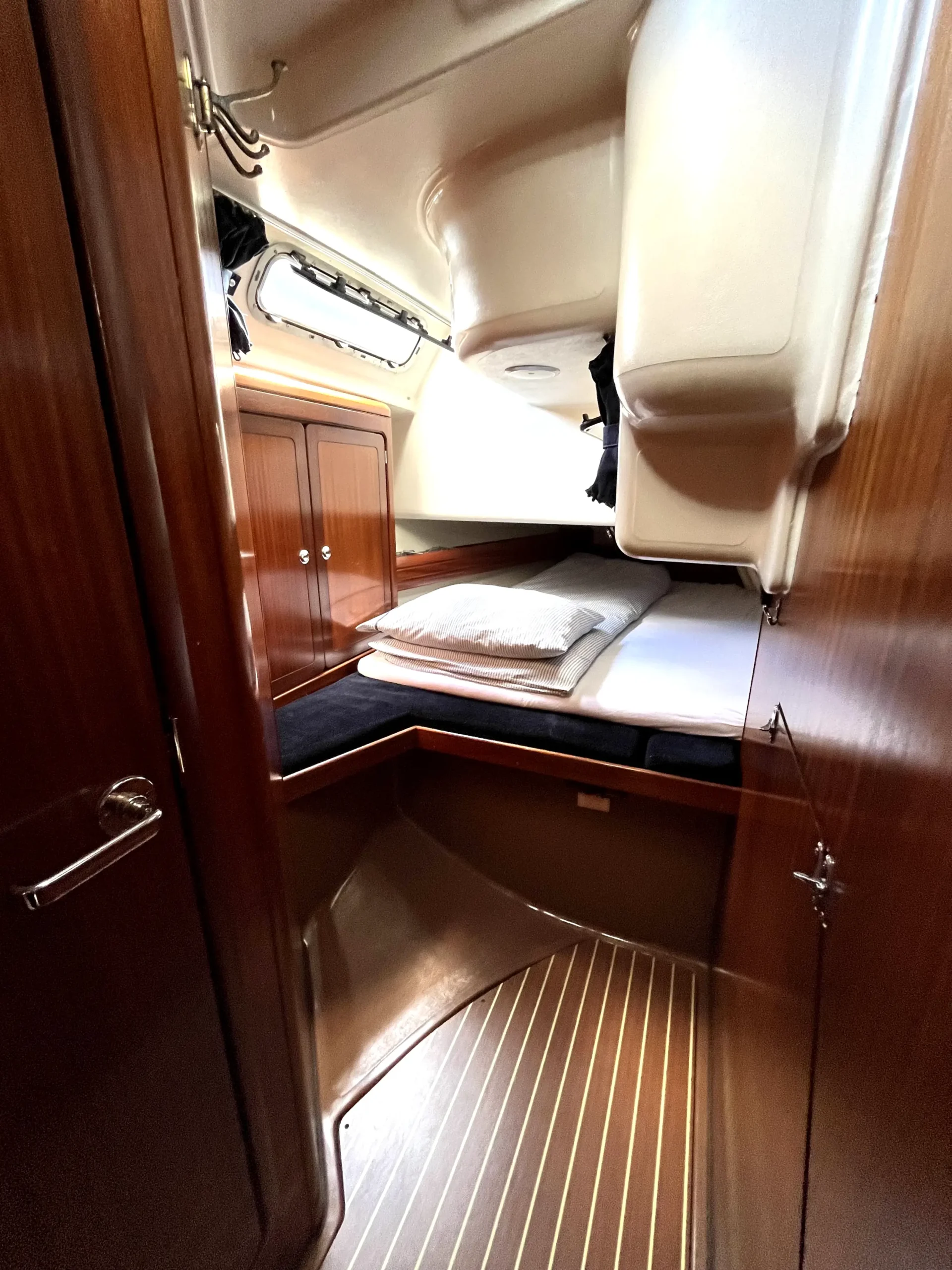 I cockpittet er der god plads til hele besætningen. Det faste cockpitbord og det fulde cockpittelt det til et naturligt samlingspunkt både under sejlads og i havn – i al slags vejr. Båden er let at håndtere, også for mindre besætninger, takket være rulleforsejl og Lazy-Jack systemet til storsejlet, som gør sejlmanøvrer enkle og sikre. En kraftig Volvo Penta-motor sørger for driftssikker fremdrift, og båden er udstyret med autopilot, kortplotter, vindinstrumenter, elektrisk ankerspil samt bovpropel – alt, hvad man har brug for til ubekymret sejlads.
