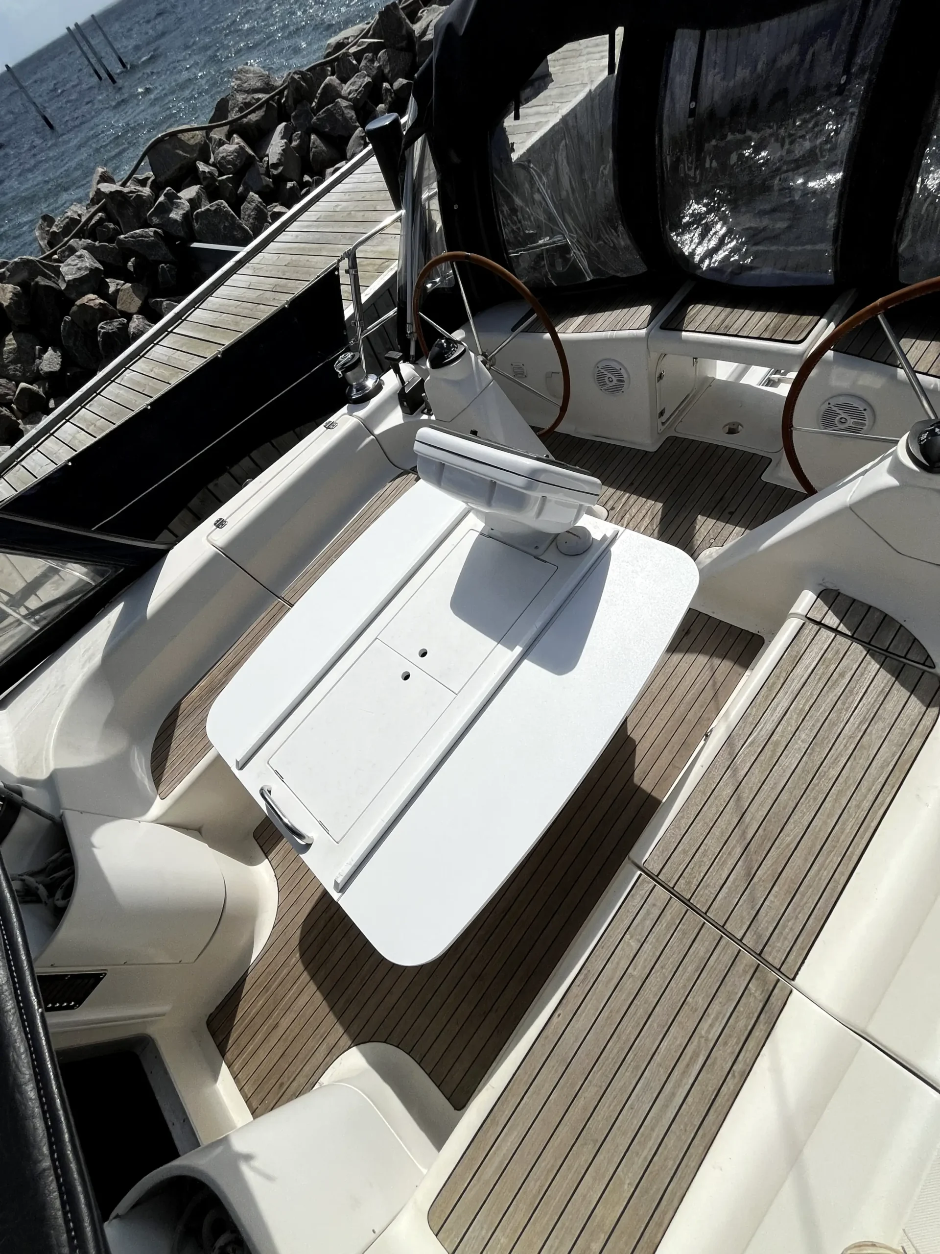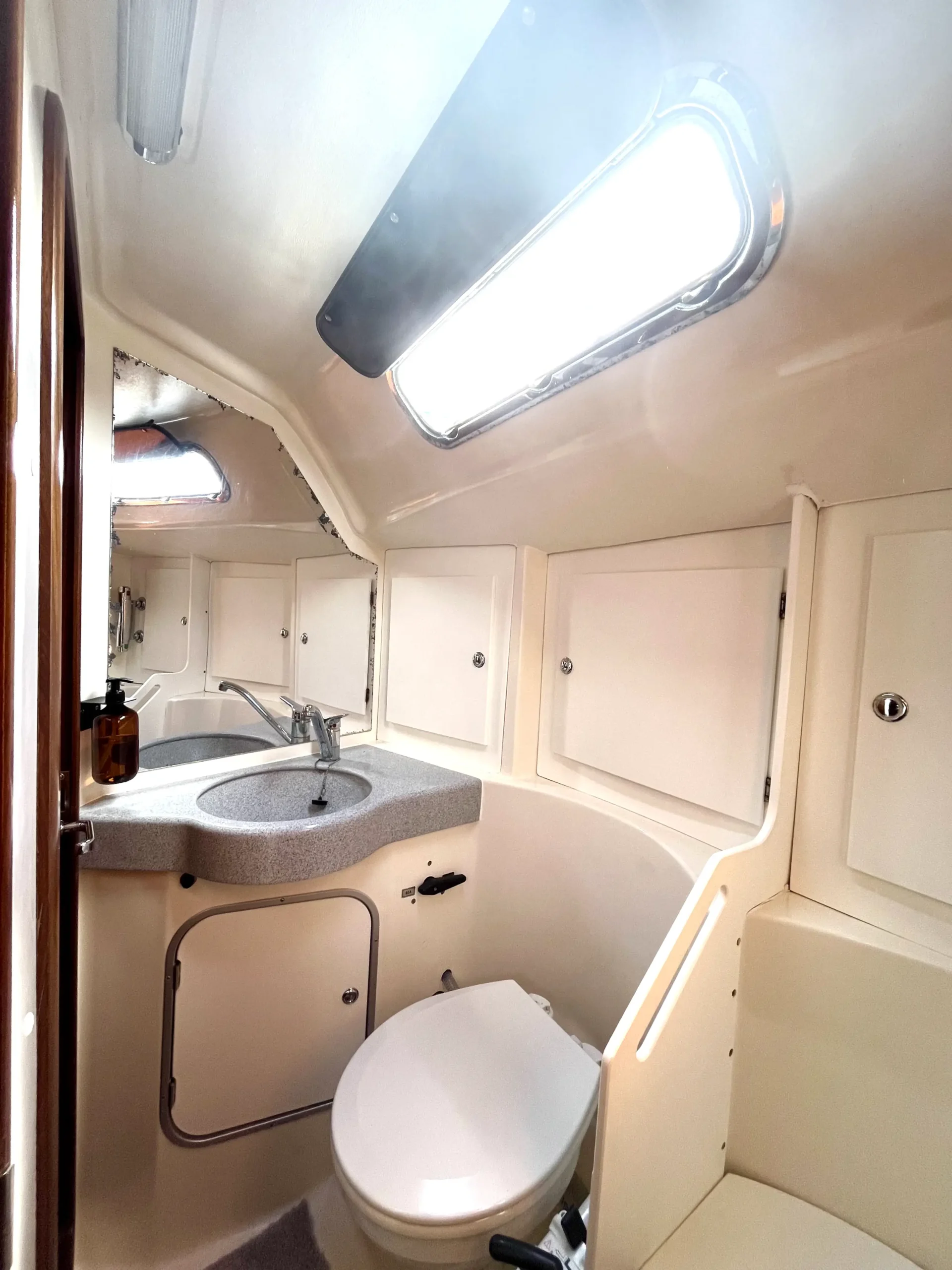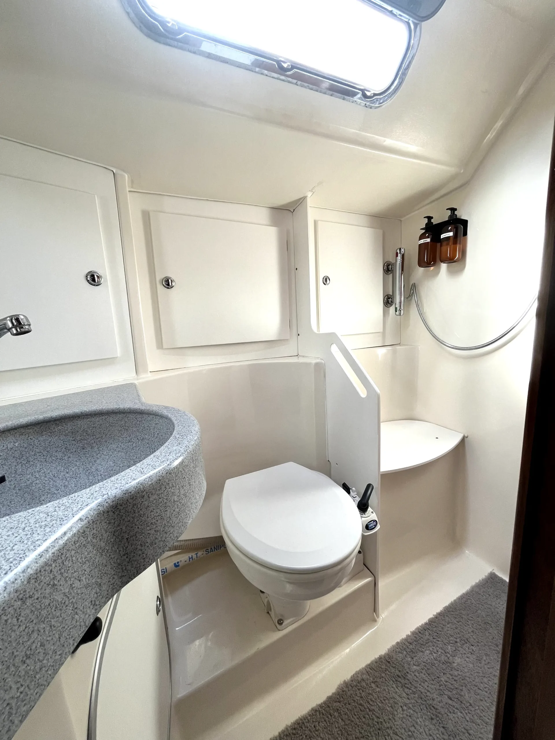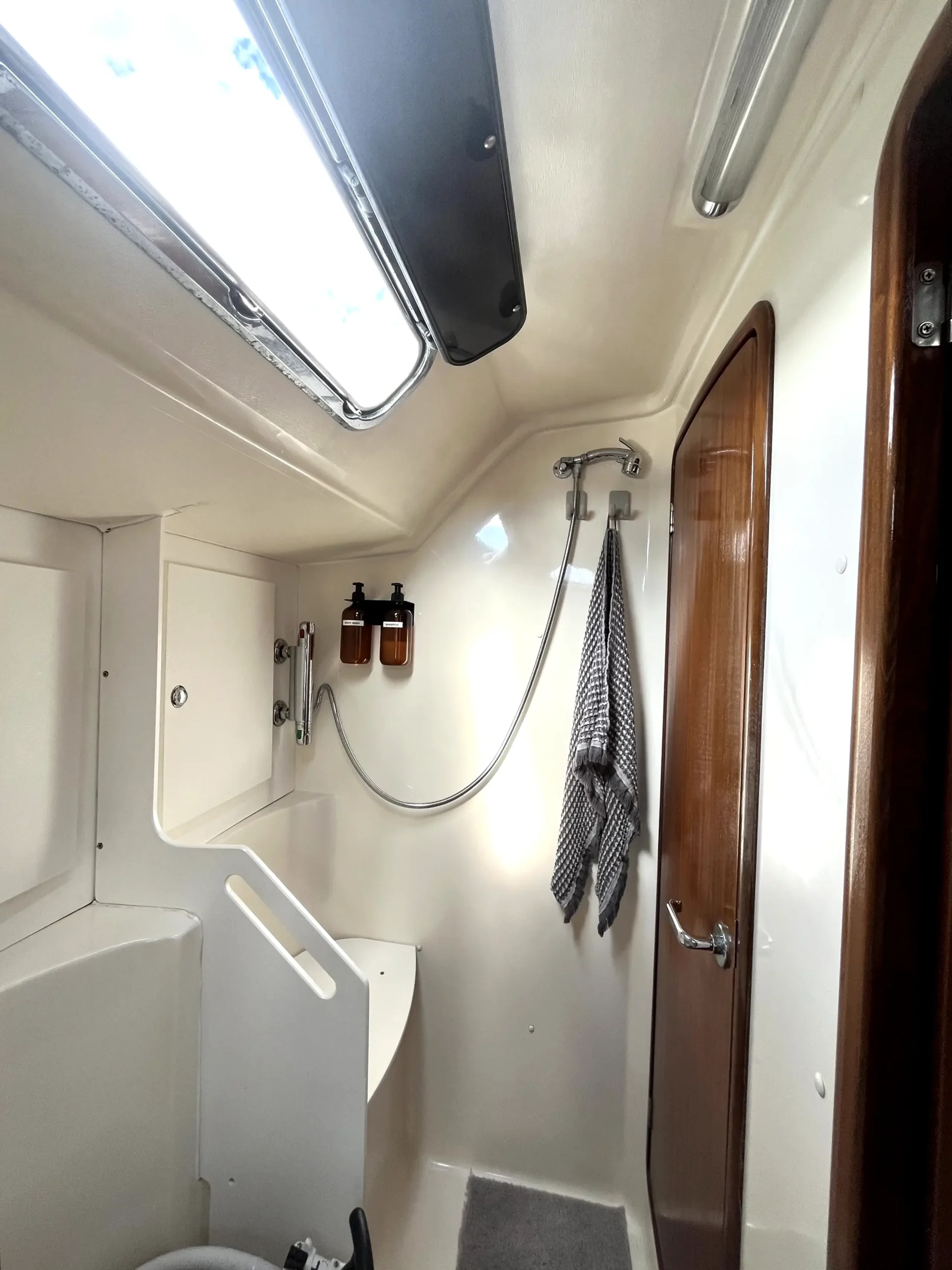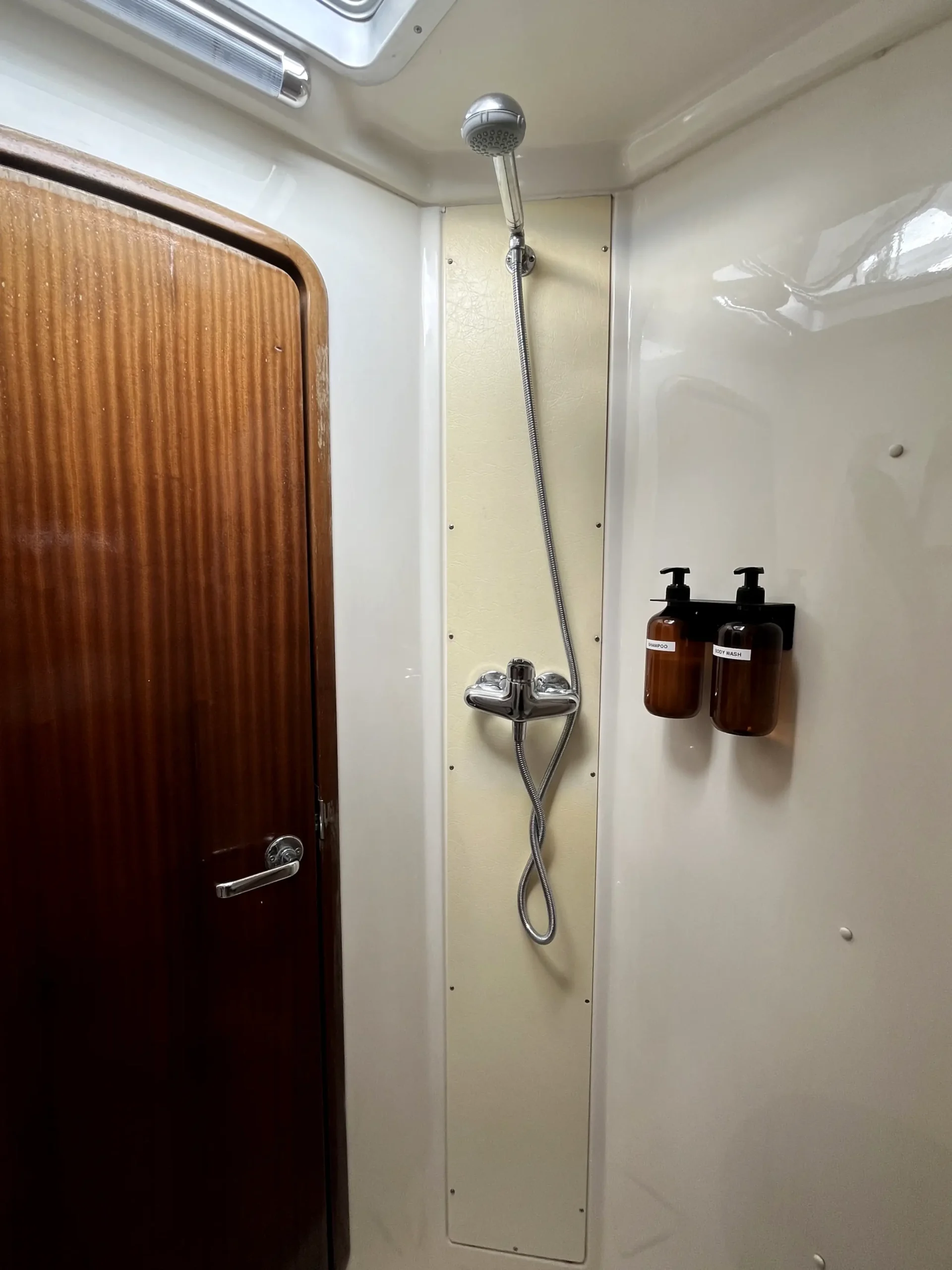 I cockpittet er der god plads til hele besætningen. Det faste cockpitbord og det fulde cockpittelt det til et naturligt samlingspunkt både under sejlads og i havn – i al slags vejr. Båden er let at håndtere, også for mindre besætninger, takket være rulleforsejl og Lazy-Jack systemet til storsejlet, som gør sejlmanøvrer enkle og sikre. En kraftig Volvo Penta-motor sørger for driftssikker fremdrift, og båden er udstyret med autopilot, kortplotter, vindinstrumenter, elektrisk ankerspil samt bovpropel – alt, hvad man har brug for til ubekymret sejlads.