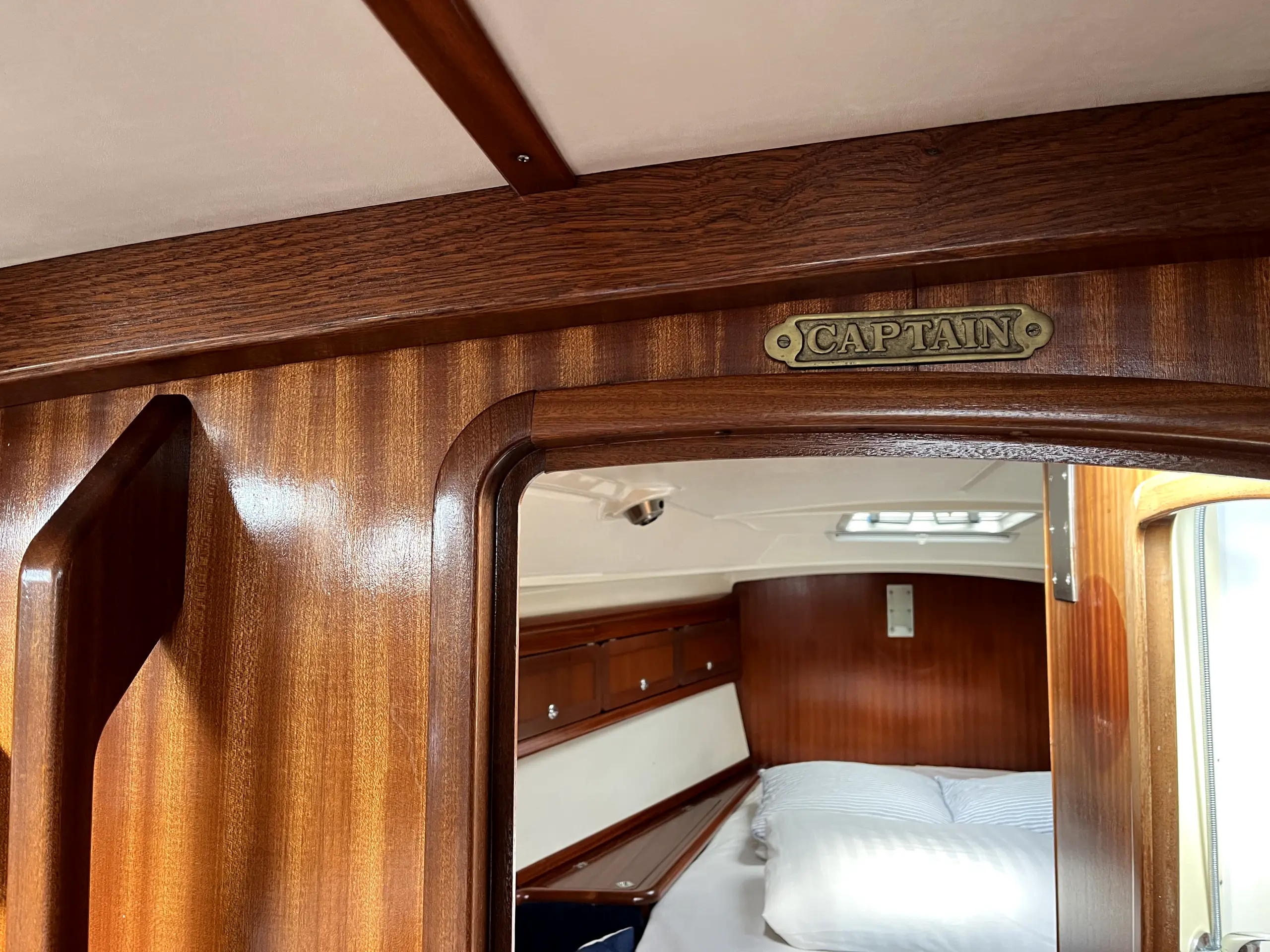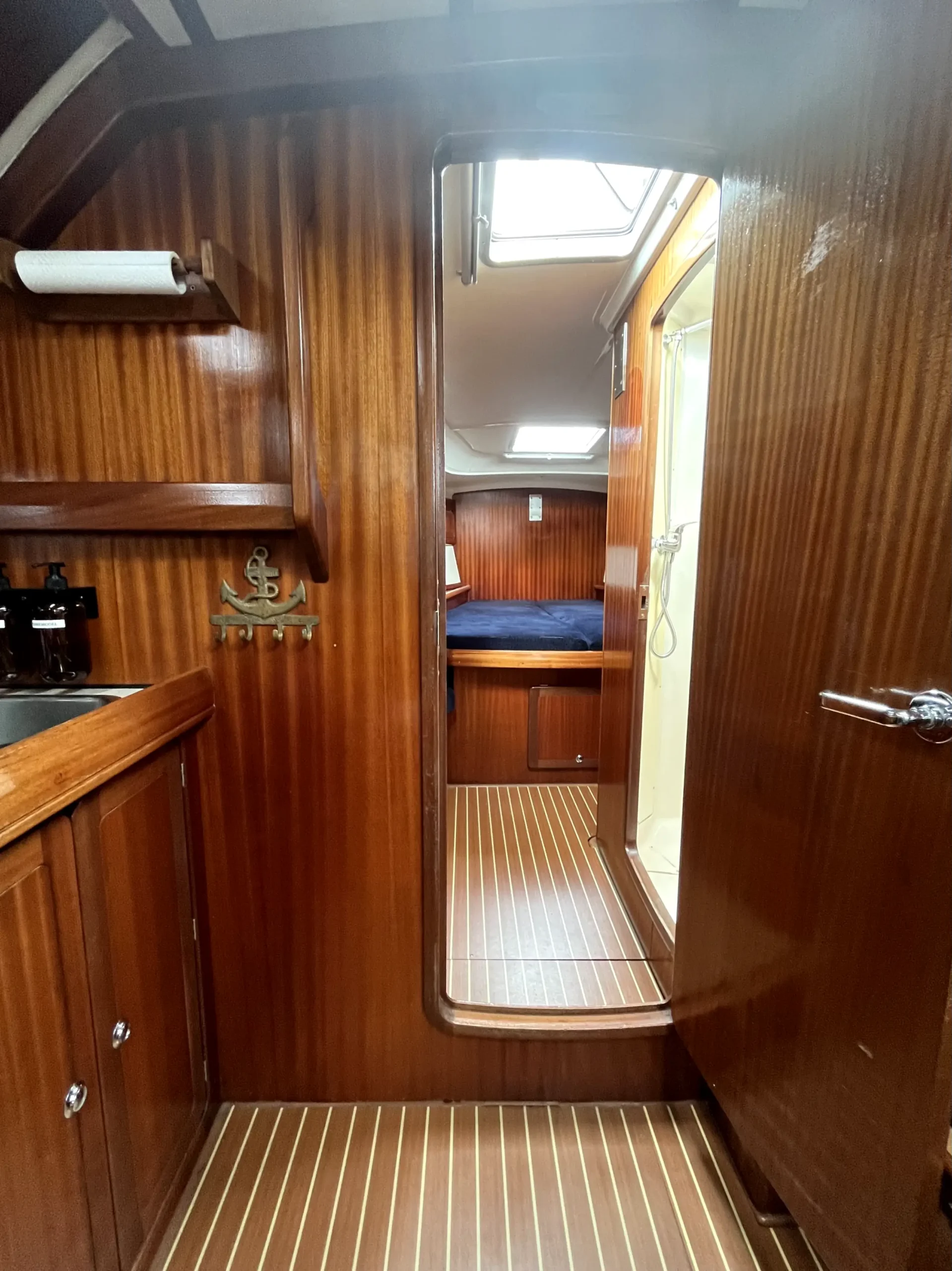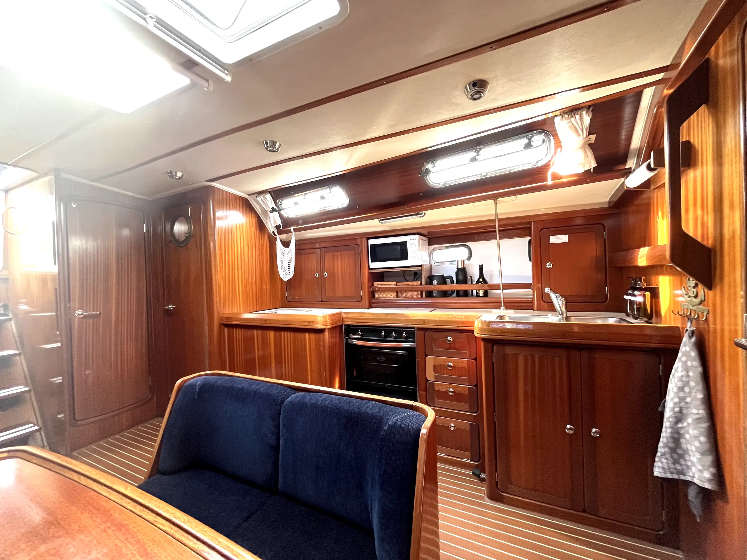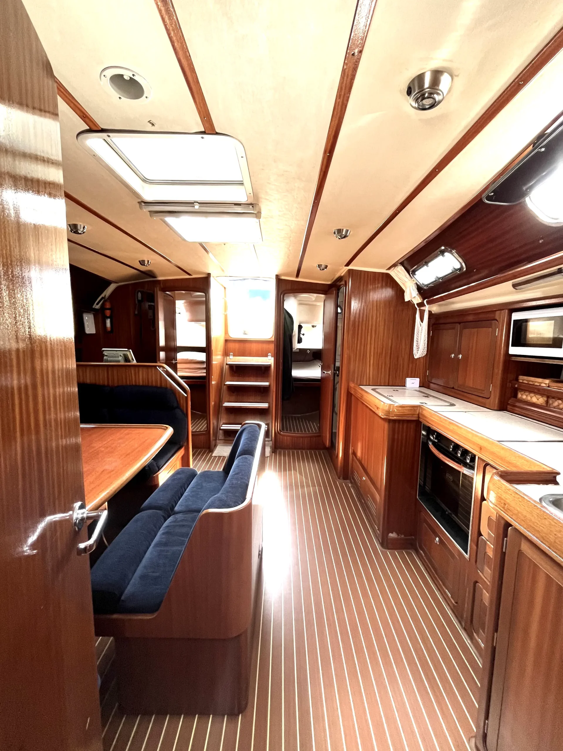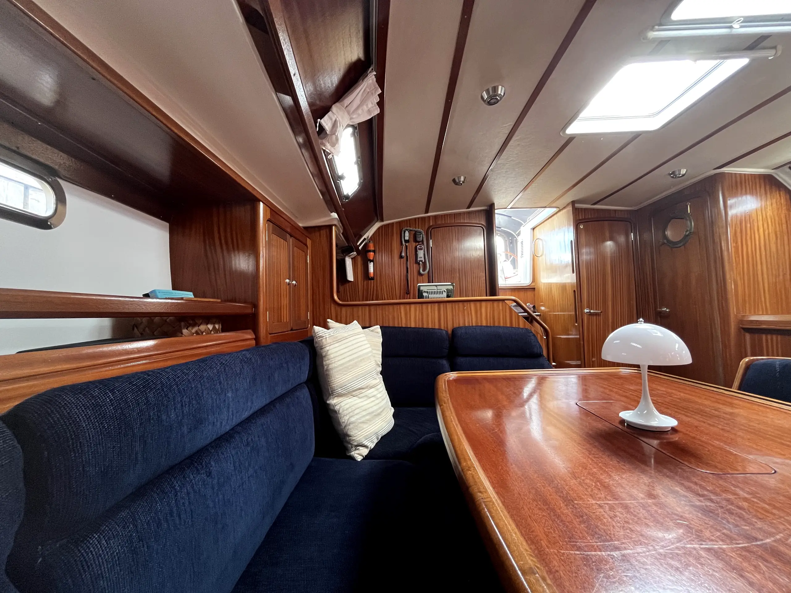 Ombord mødes man af et lyst og velholdt interiør i klassisk teak. Den store salon rummer både spiseplads, kortbord og et funktionelt pantry med komfur, ovn, køleskab og god opbevaringsplads. Der er tre rummelige kabiner med i alt seks sovepladser samt to badeværelser med toilet og bruser – alt sammen indrettet med fokus på komfort og praktisk anvendelighed.