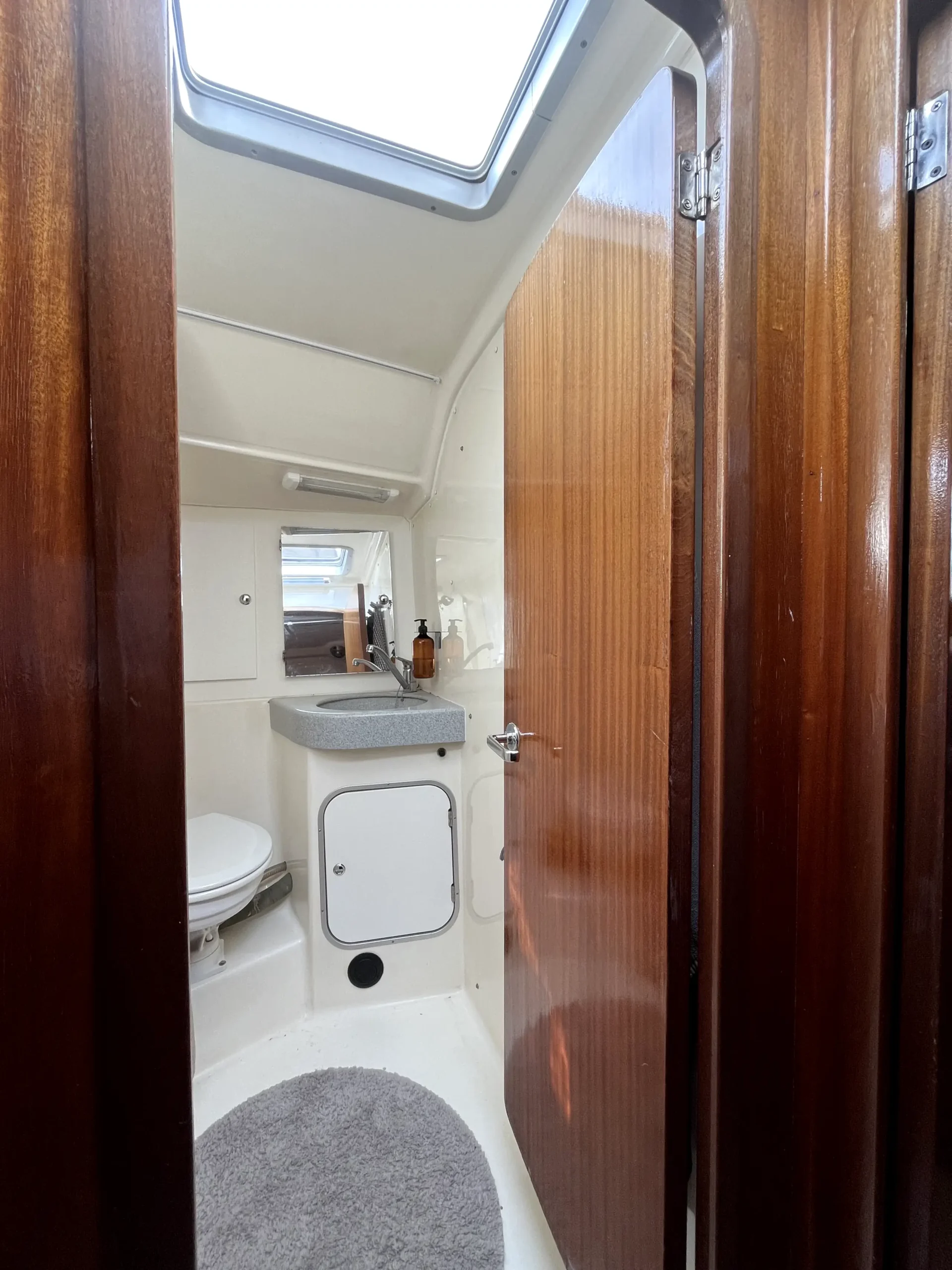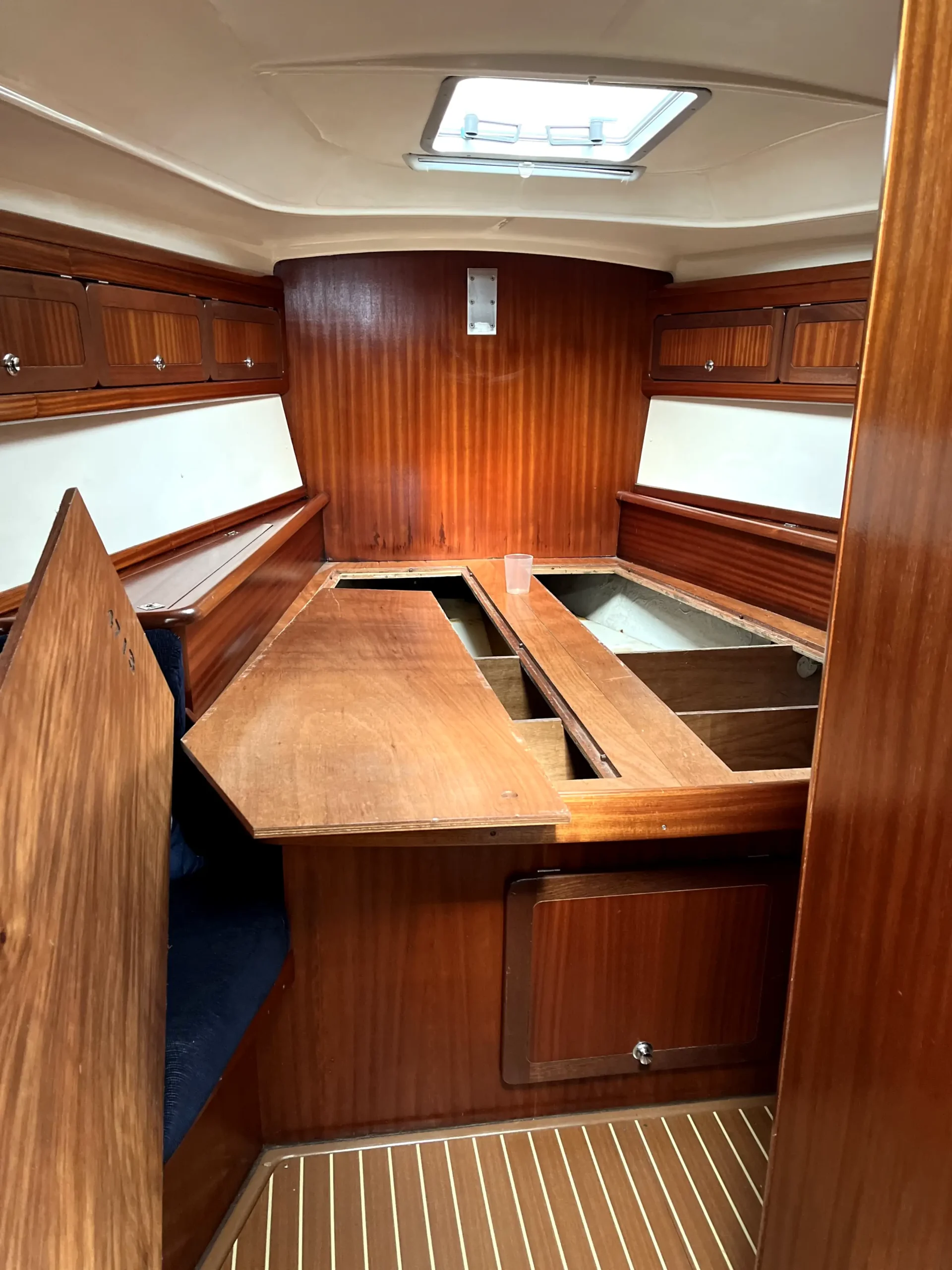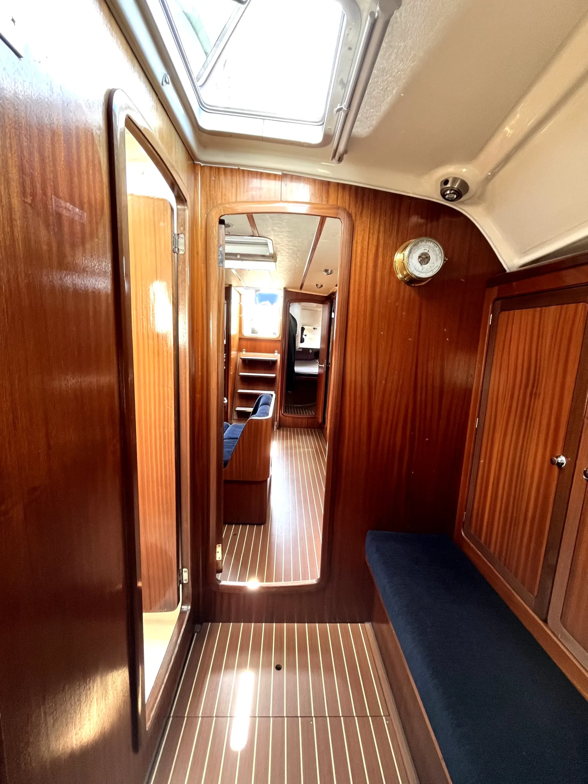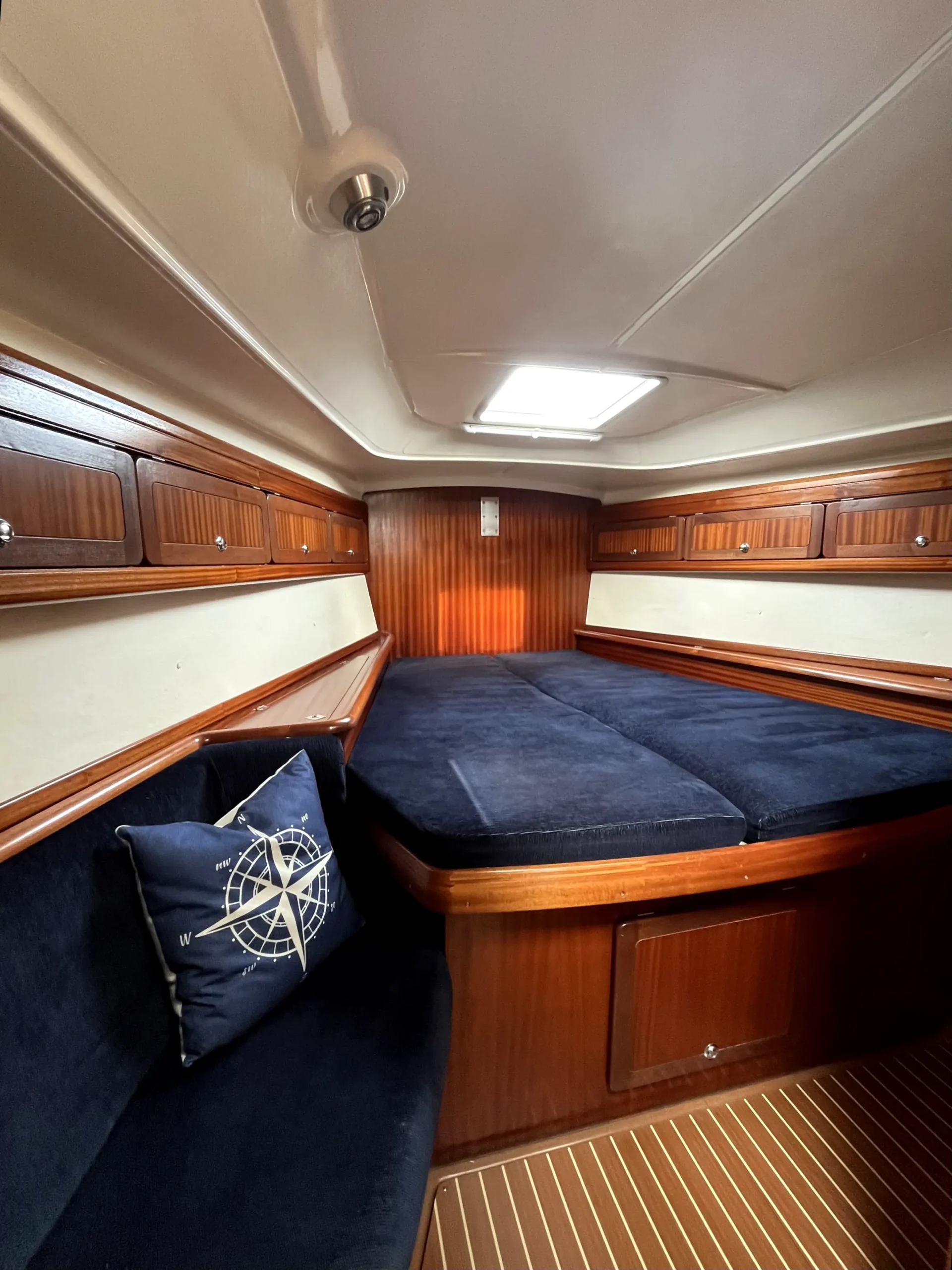 Ombord mødes man af et lyst og velholdt interiør i klassisk teak. Den store salon rummer både spiseplads, kortbord og et funktionelt pantry med komfur, ovn, køleskab og god opbevaringsplads. Der er tre rummelige kabiner med i alt seks sovepladser samt to badeværelser med toilet og bruser – alt sammen indrettet med fokus på komfort og praktisk anvendelighed.
