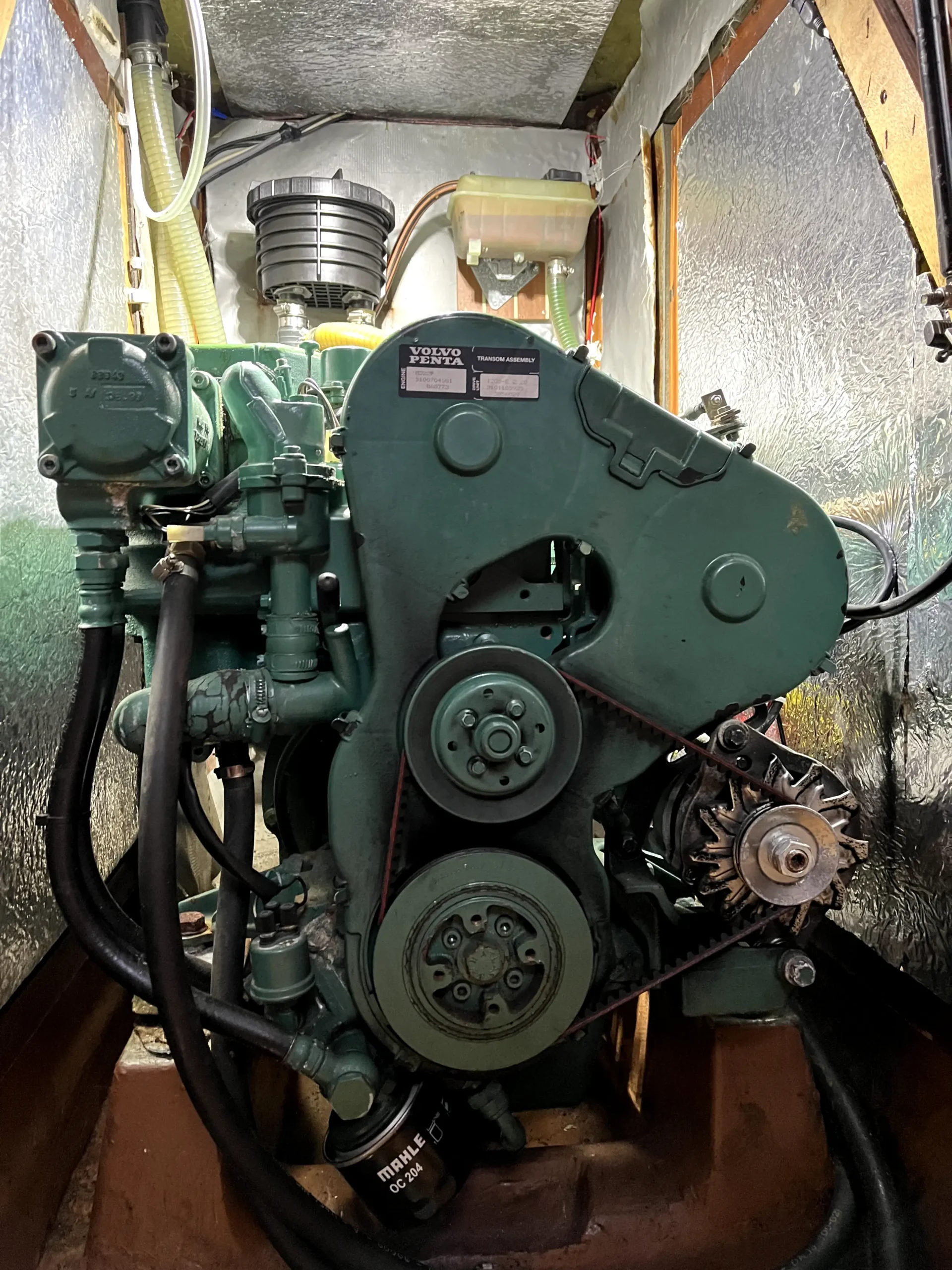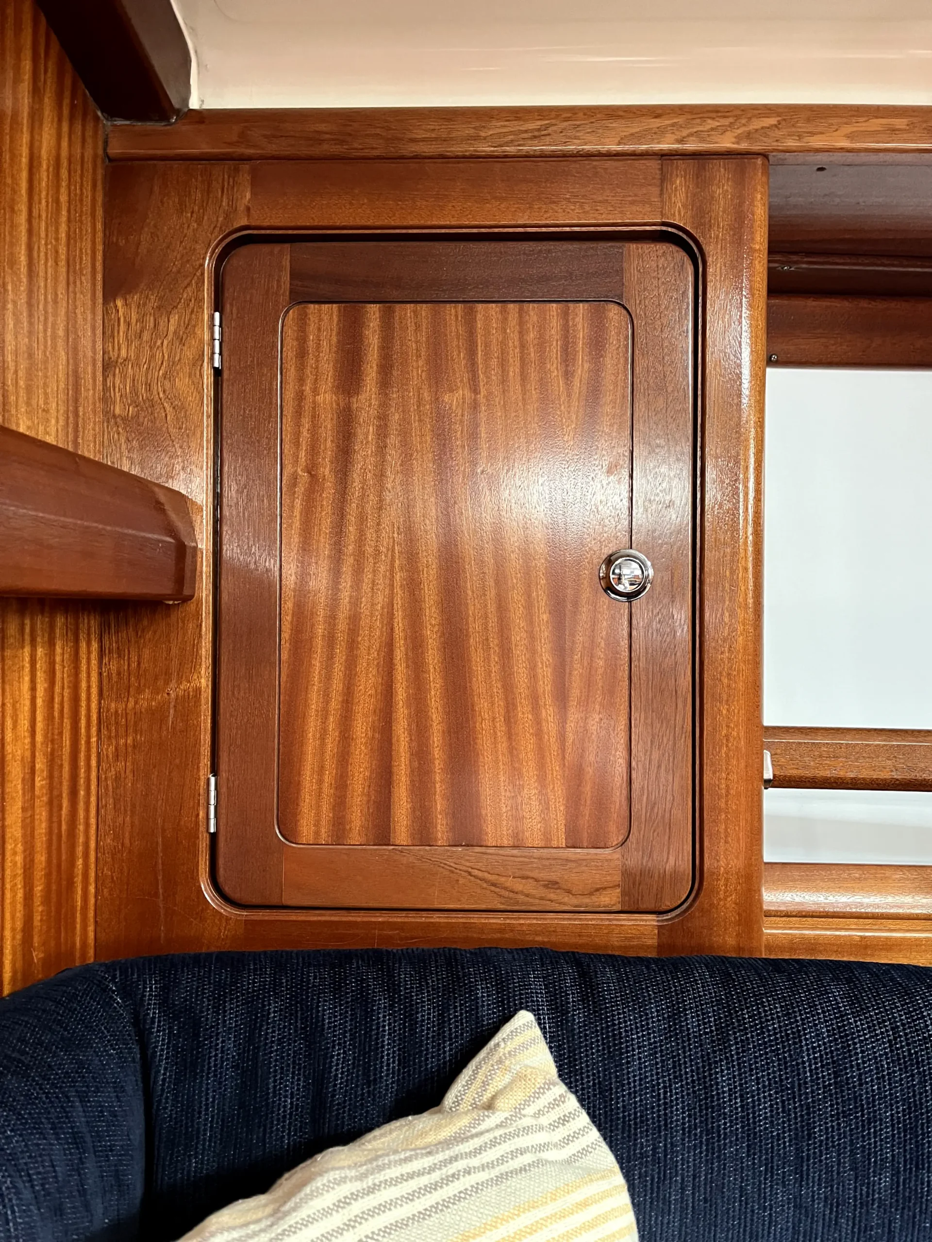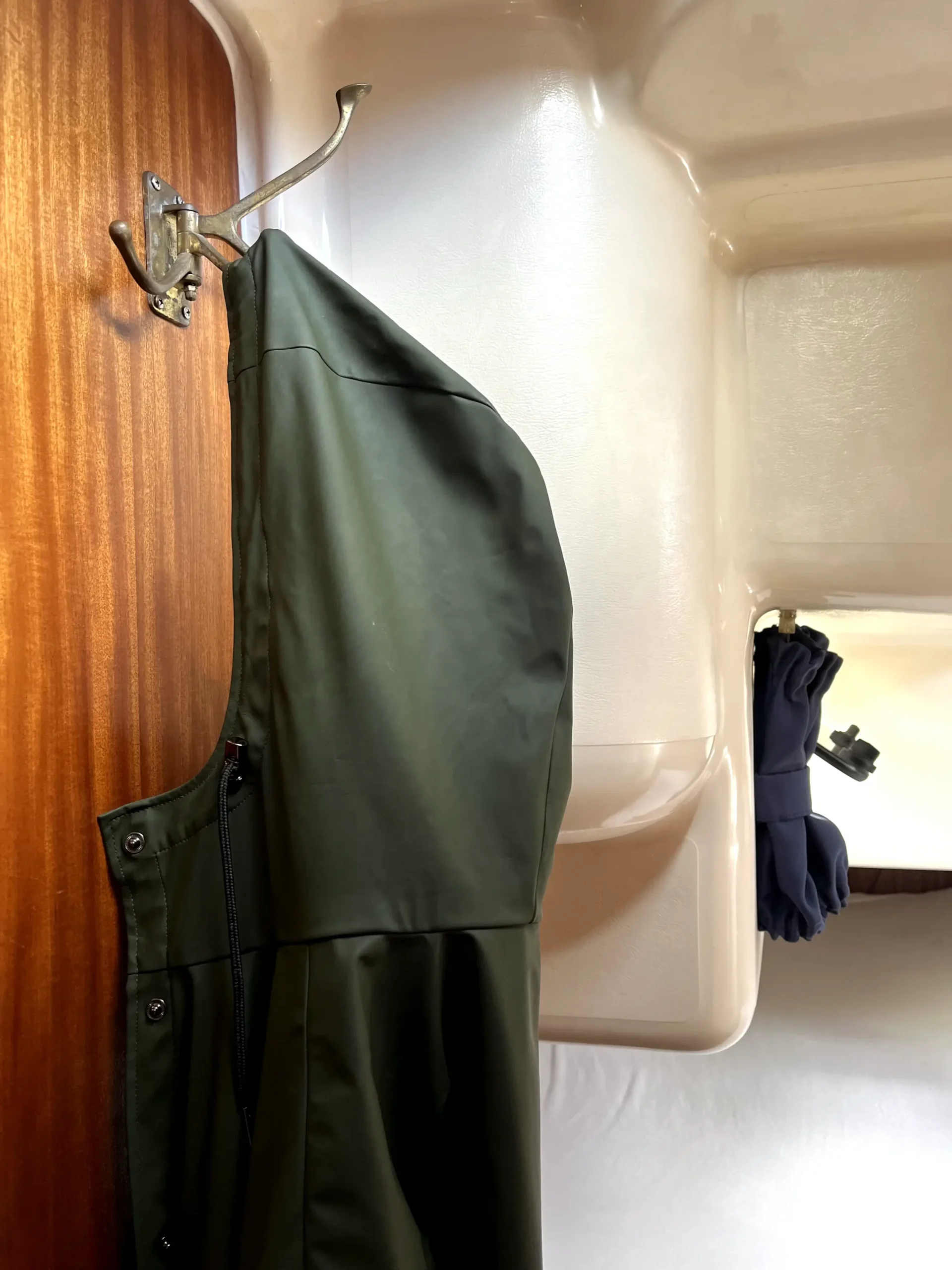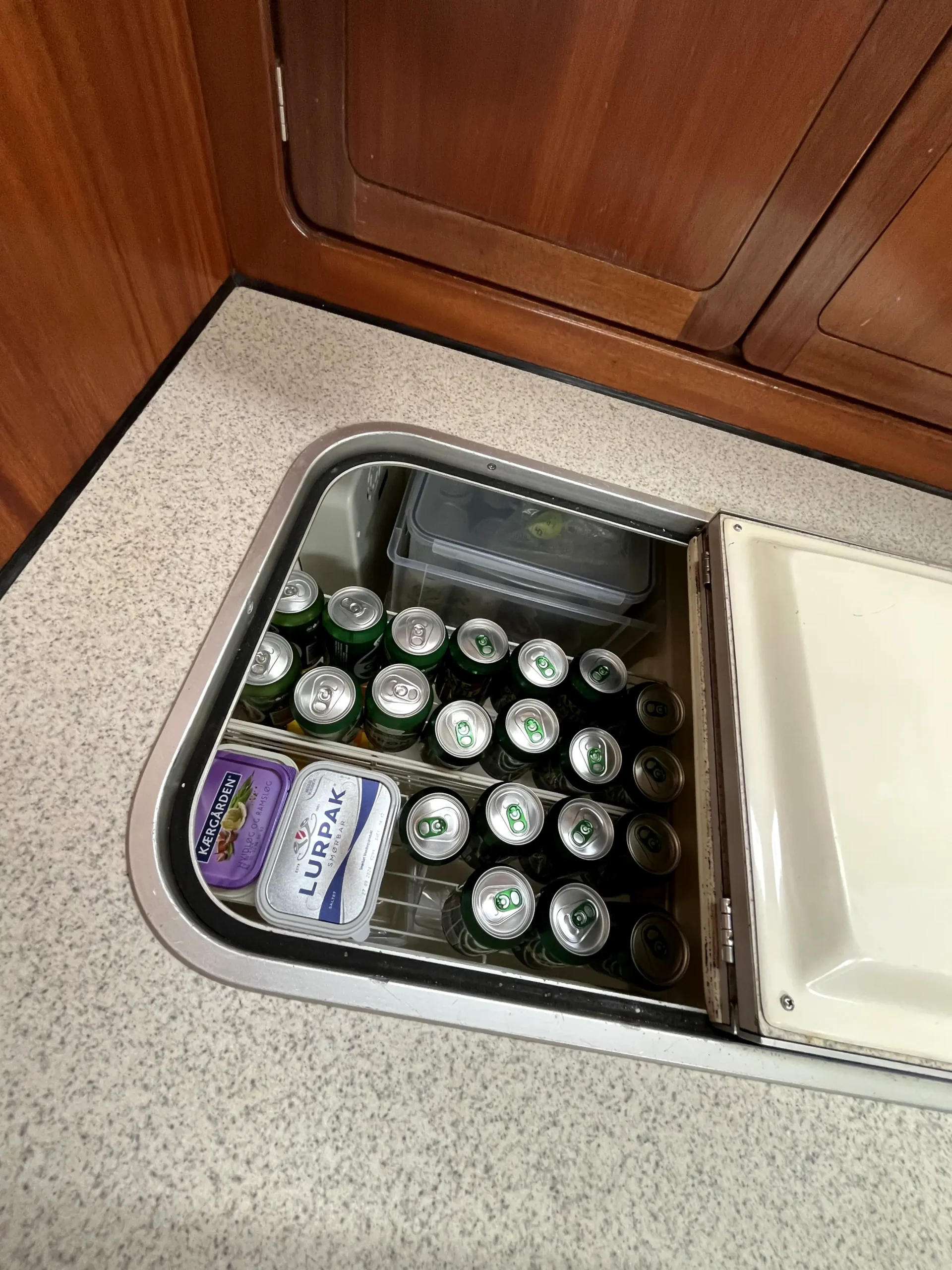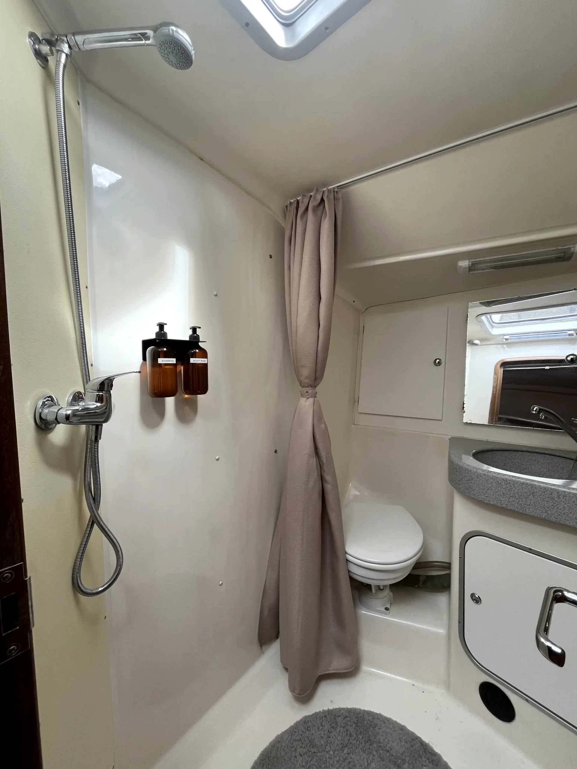 Ombord mødes man af et lyst og velholdt interiør i klassisk teak. Den store salon rummer både spiseplads, kortbord og et funktionelt pantry med komfur, ovn, køleskab og god opbevaringsplads. Der er tre rummelige kabiner med i alt seks sovepladser samt to badeværelser med toilet og bruser – alt sammen indrettet med fokus på komfort og praktisk anvendelighed.