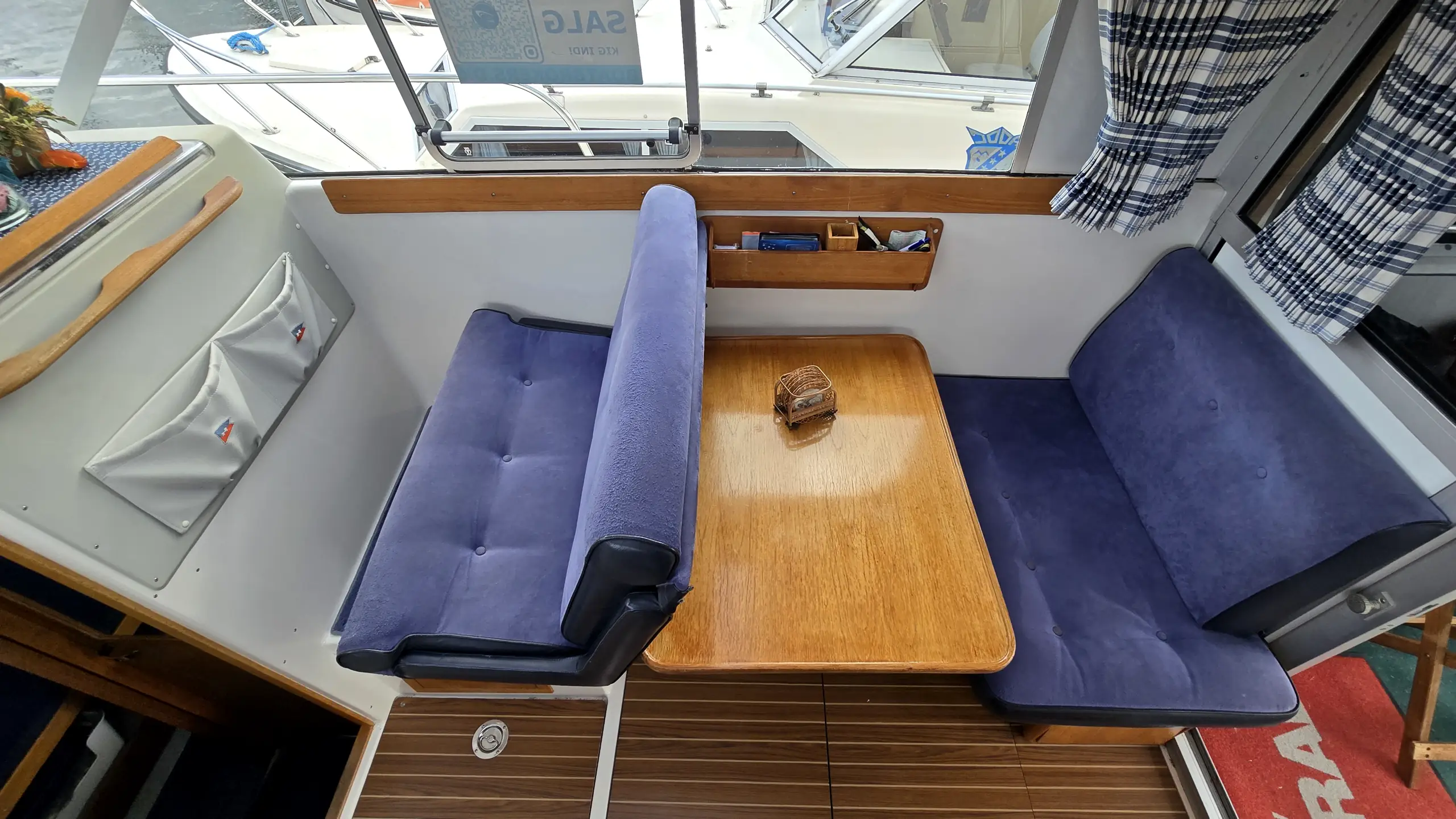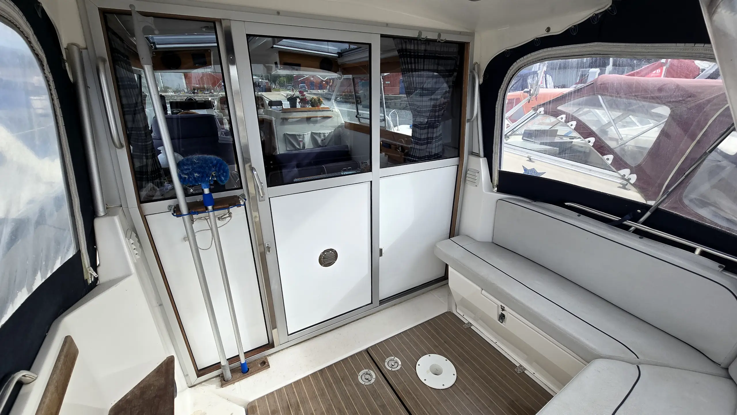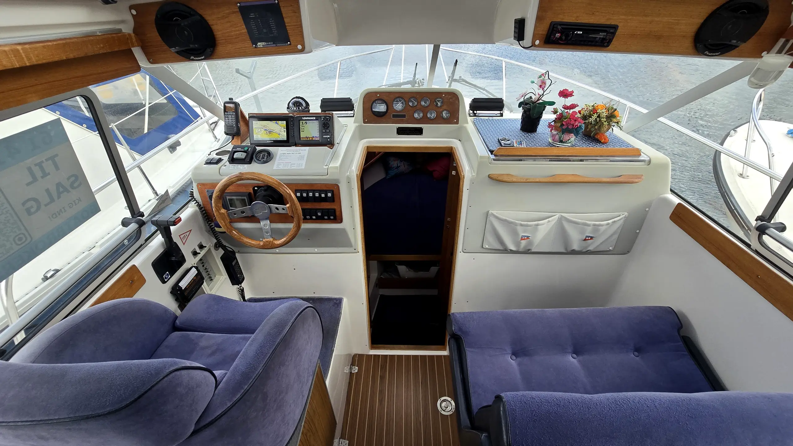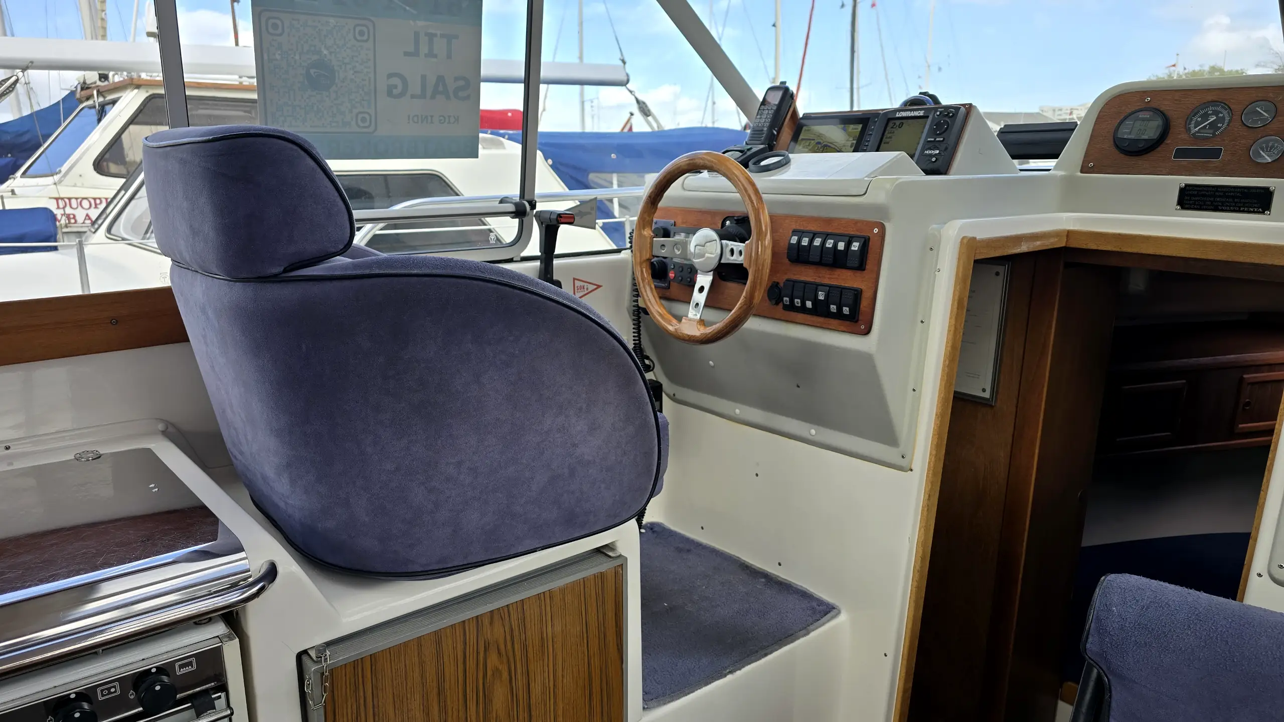 Videre fram fra køkkennet finder vi styrmandspositionen med en komfortabel stol og godt udsyn hele vejen rundt. Den forreste sofa kan ligeledes vippes om så besætningen også kan følge med omgivelserne under overfarten. Denne bliver gjort muligt af en Volvo Penta TAMD31P med 150 heste, der har kørt under 1000 timer.