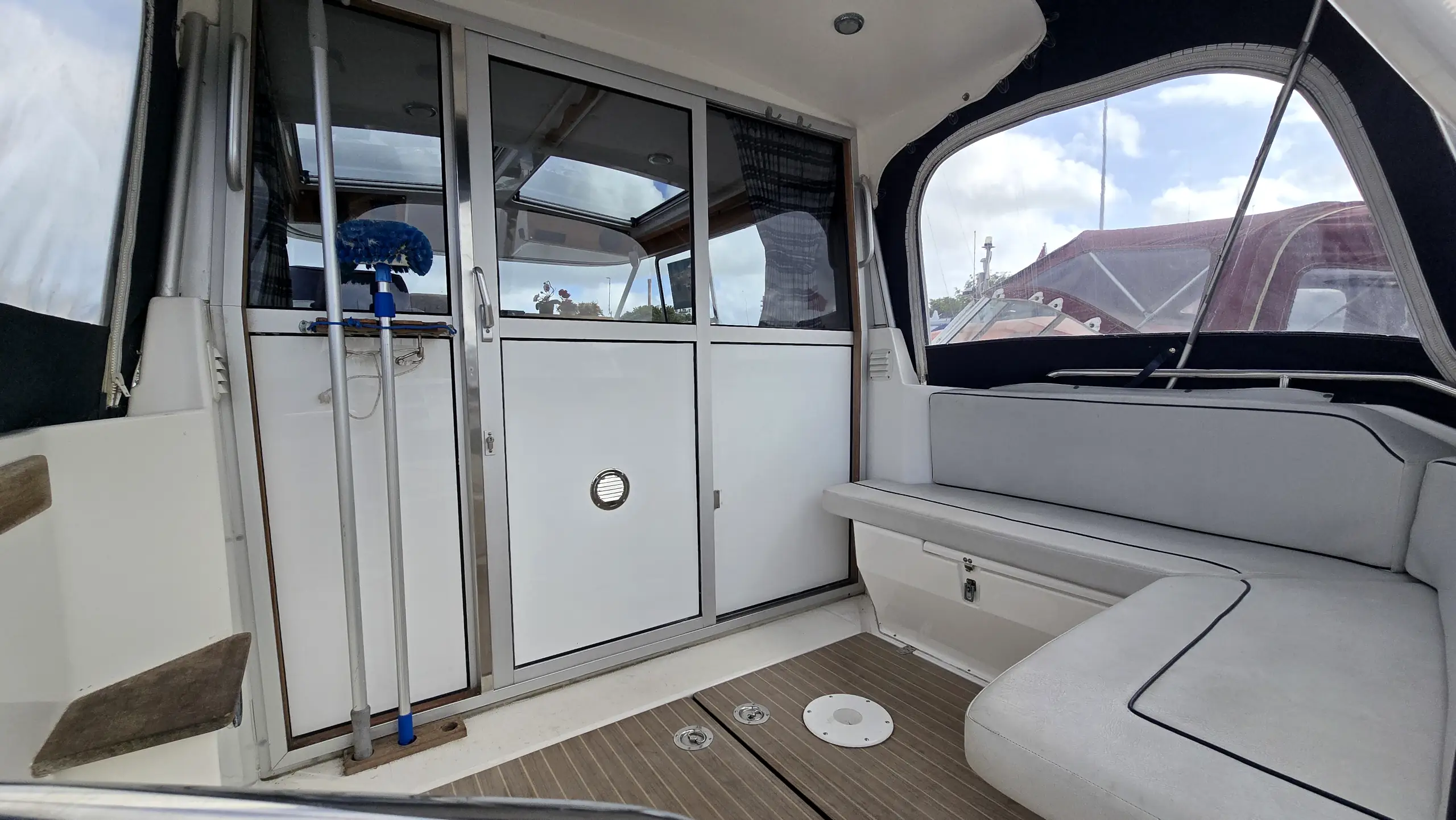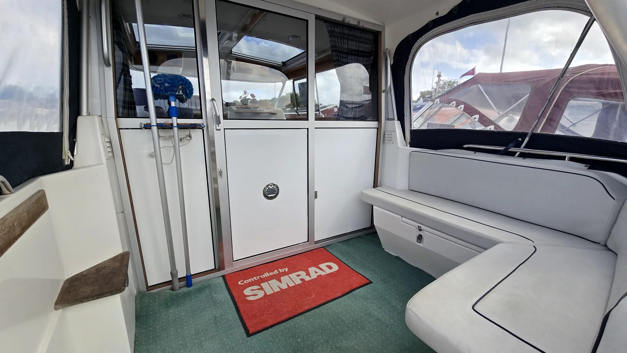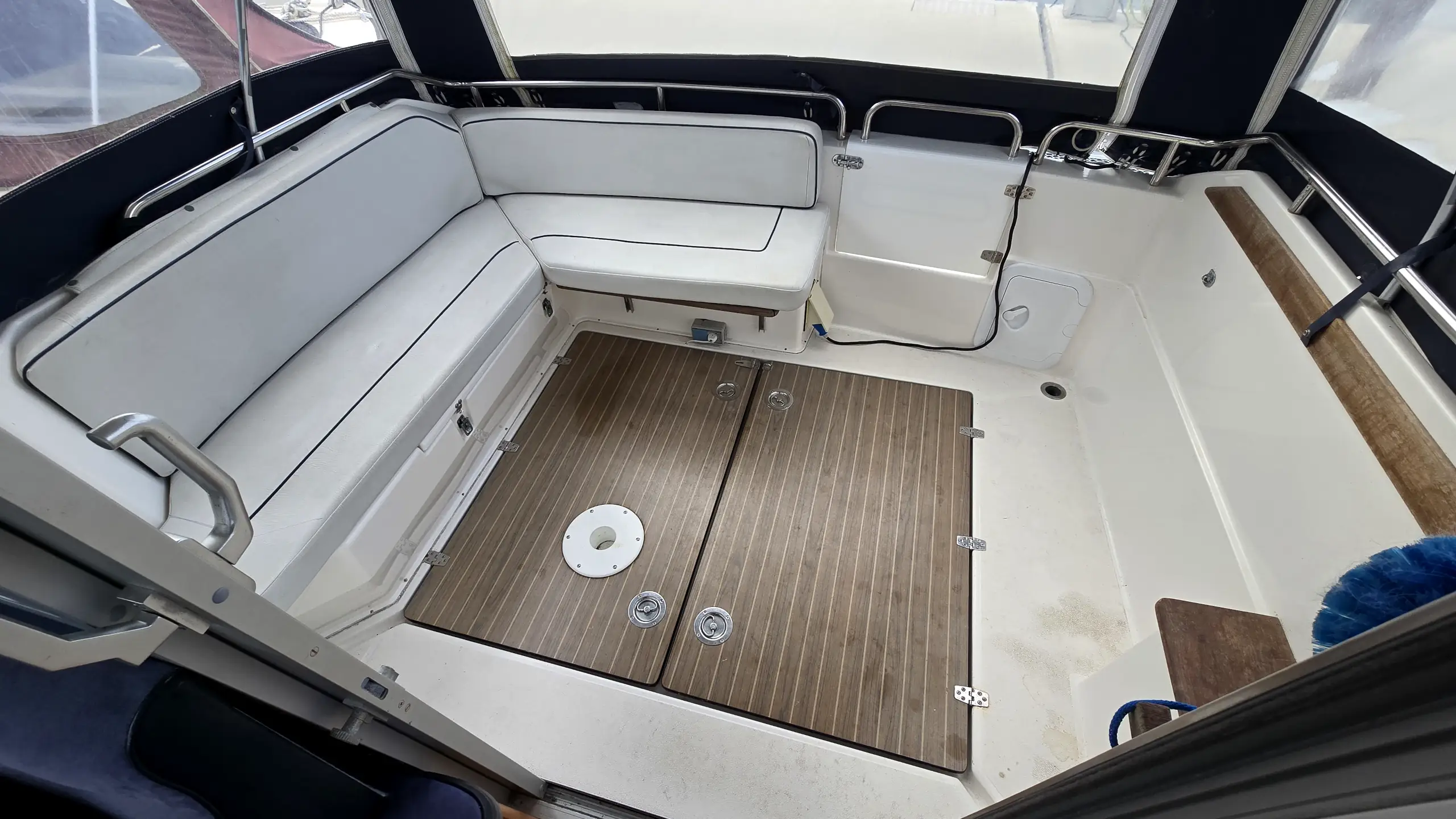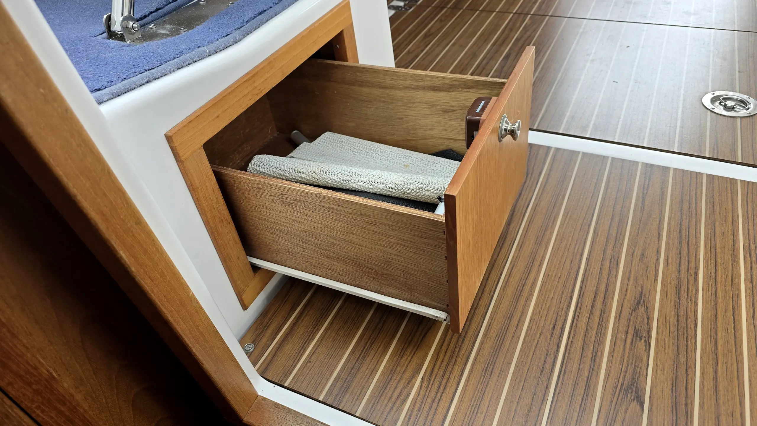 Videre fram fra køkkennet finder vi styrmandspositionen med en komfortabel stol og godt udsyn hele vejen rundt. Den forreste sofa kan ligeledes vippes om så besætningen også kan følge med omgivelserne under overfarten. Denne bliver gjort muligt af en Volvo Penta TAMD31P med 150 heste, der har kørt under 1000 timer.
