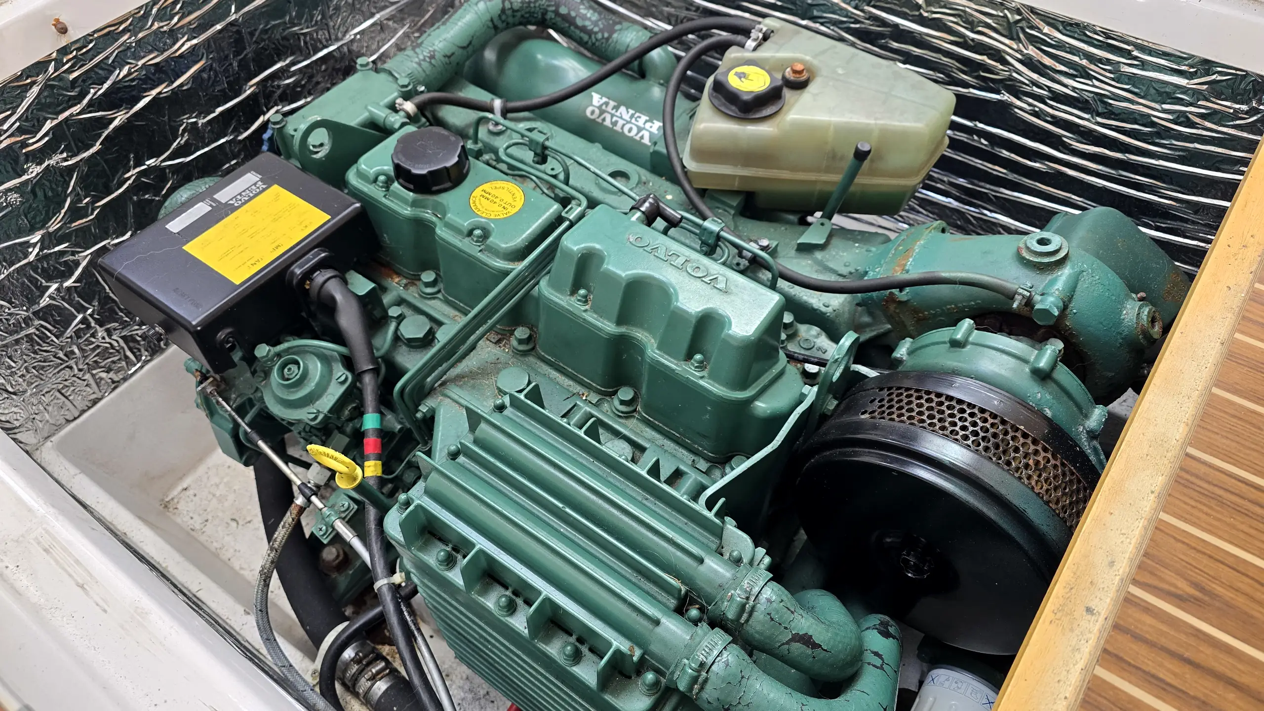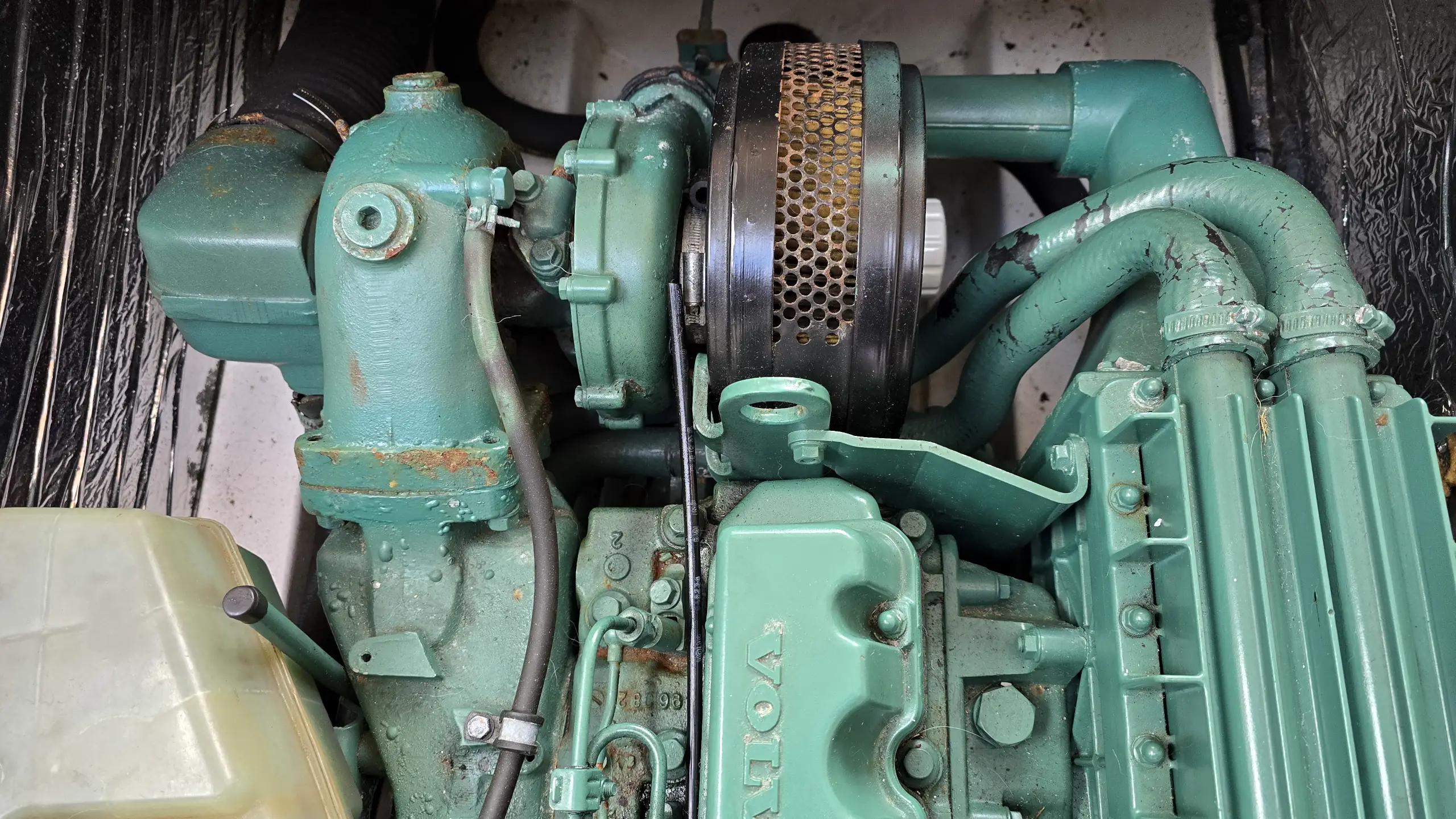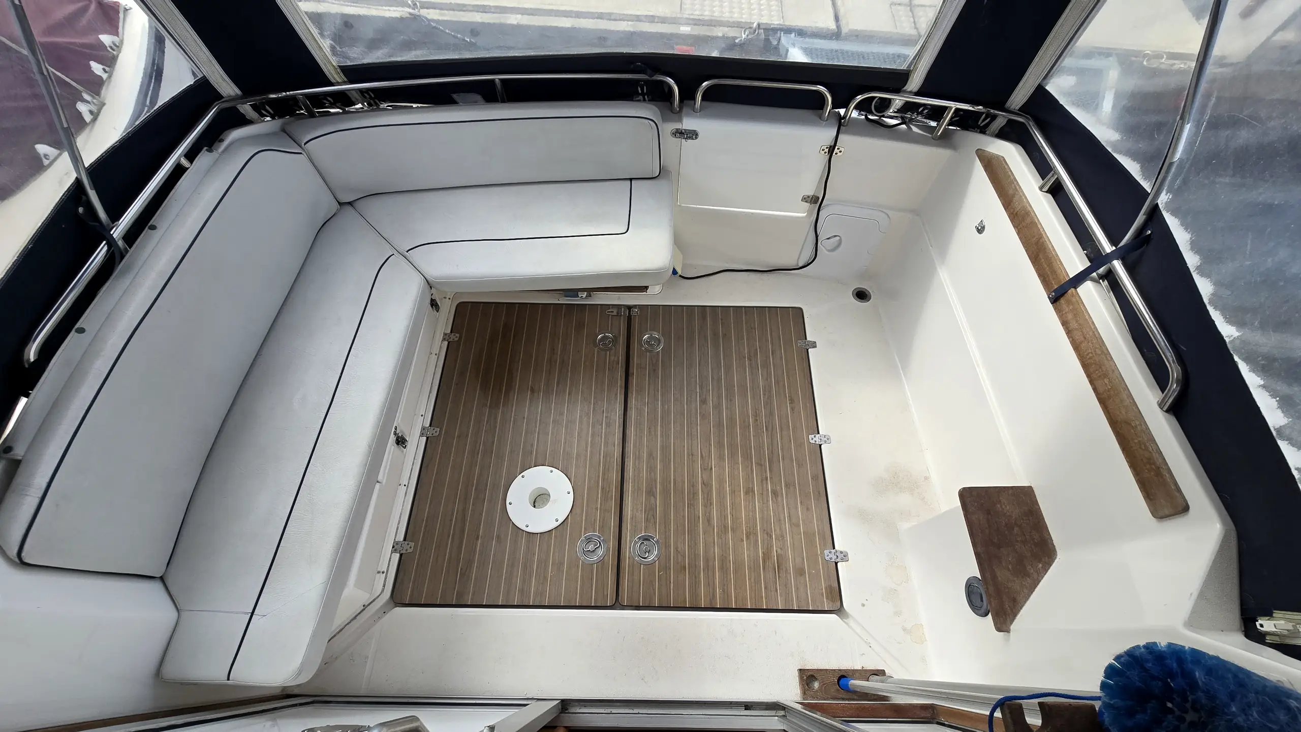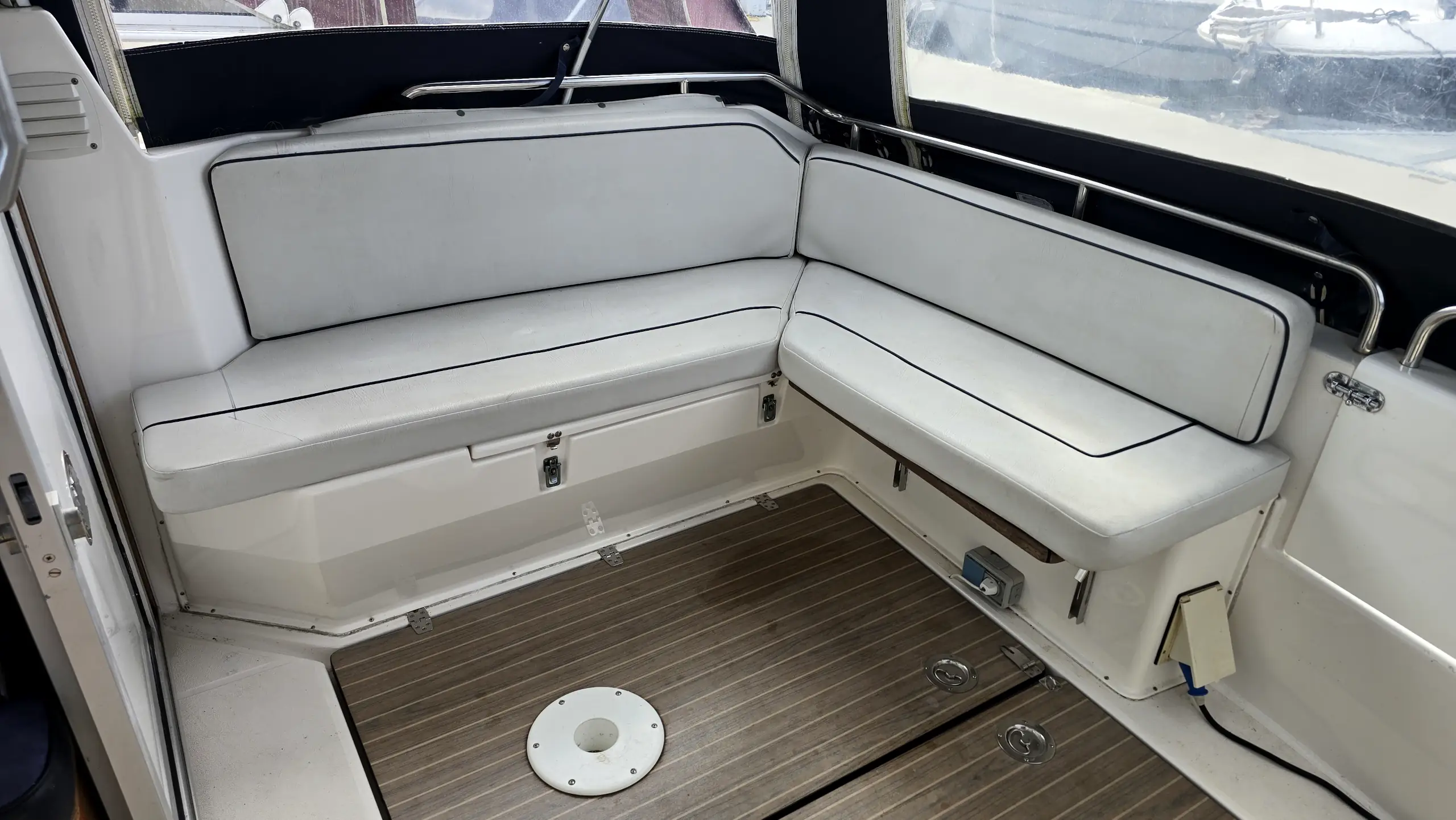 Videre fram fra køkkennet finder vi styrmandspositionen med en komfortabel stol og godt udsyn hele vejen rundt. Den forreste sofa kan ligeledes vippes om så besætningen også kan følge med omgivelserne under overfarten. Denne bliver gjort muligt af en Volvo Penta TAMD31P med 150 heste, der har kørt under 1000 timer.