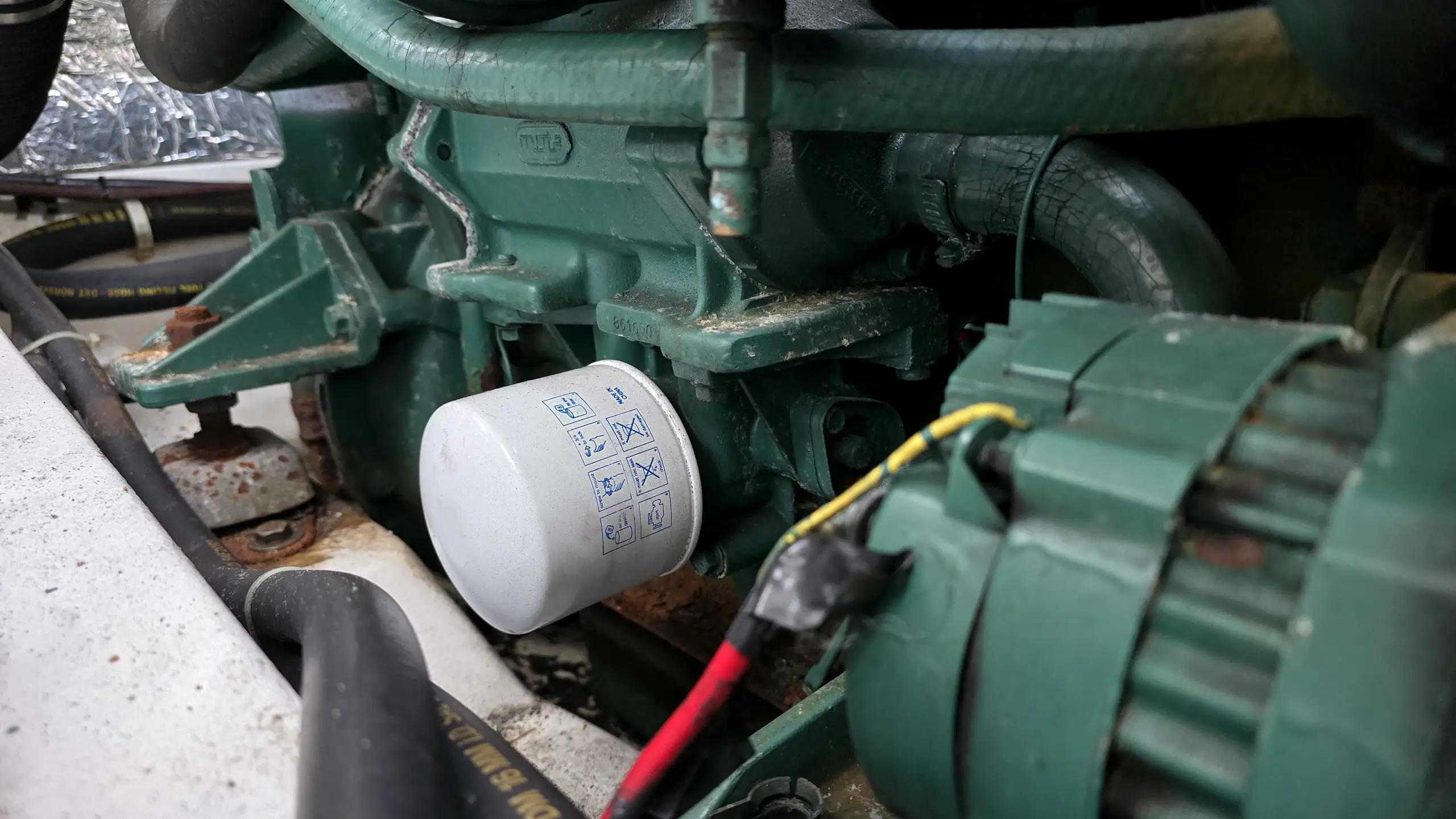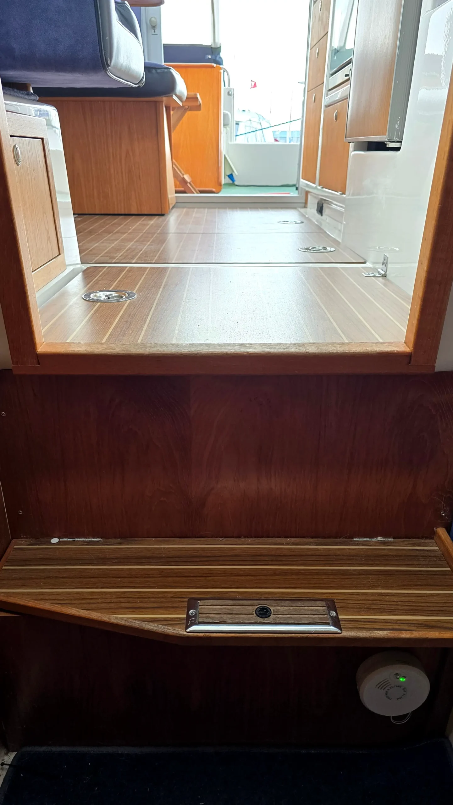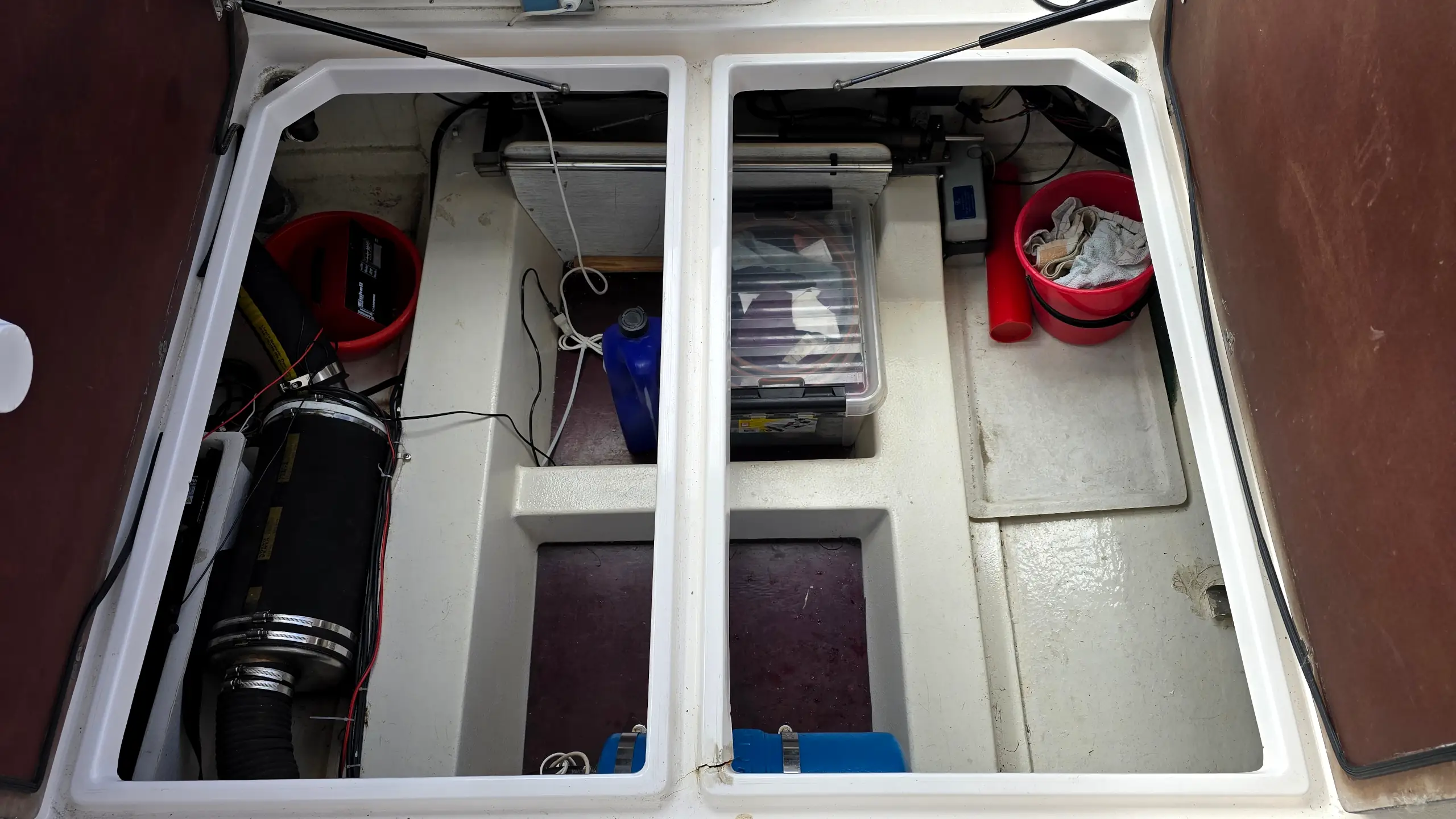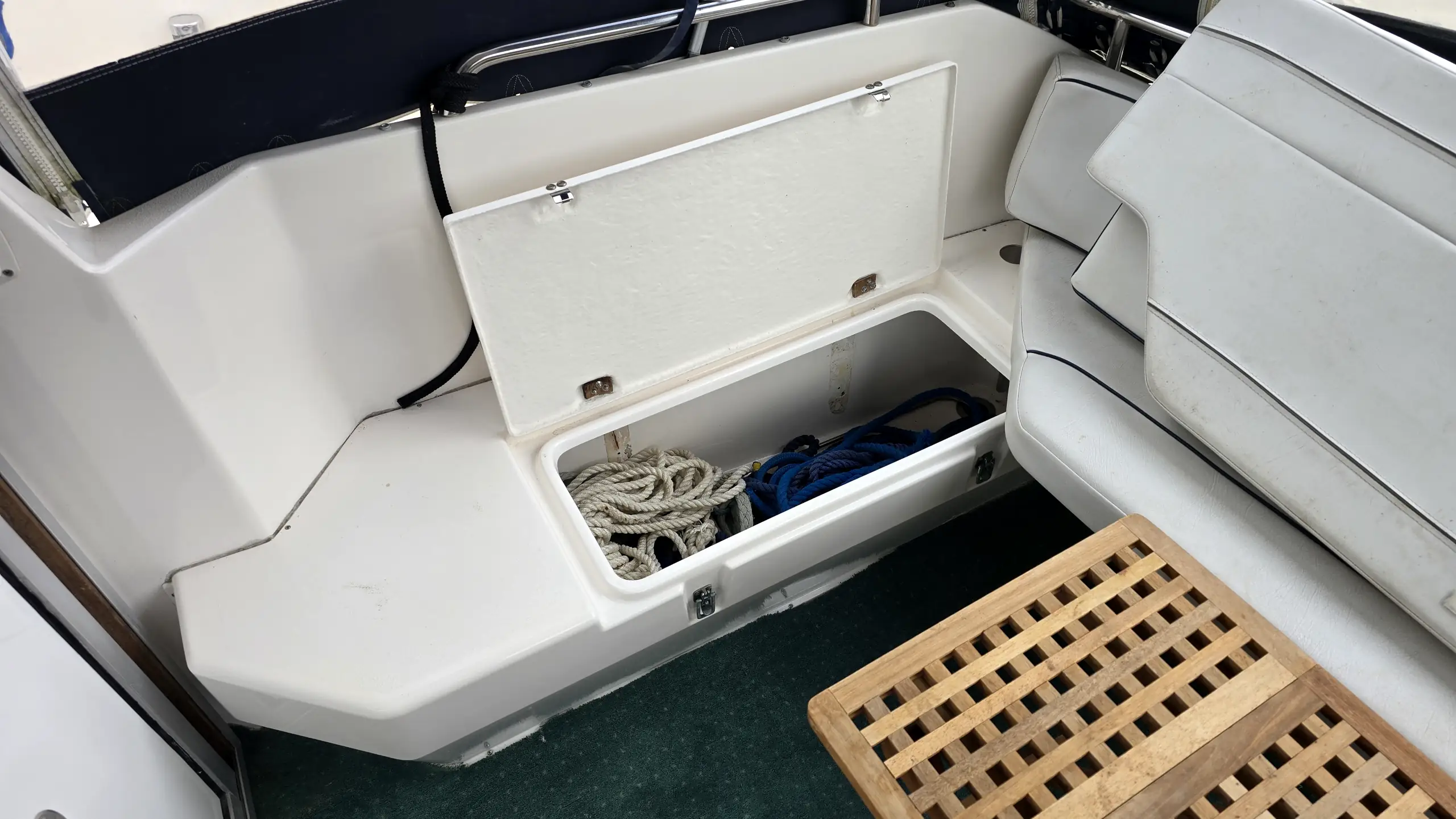Videre fram fra køkkennet finder vi styrmandspositionen med en komfortabel stol og godt udsyn hele vejen rundt. Den forreste sofa kan ligeledes vippes om så besætningen også kan følge med omgivelserne under overfarten. Denne bliver gjort muligt af en Volvo Penta TAMD31P med 150 heste, der har kørt under 1000 timer.