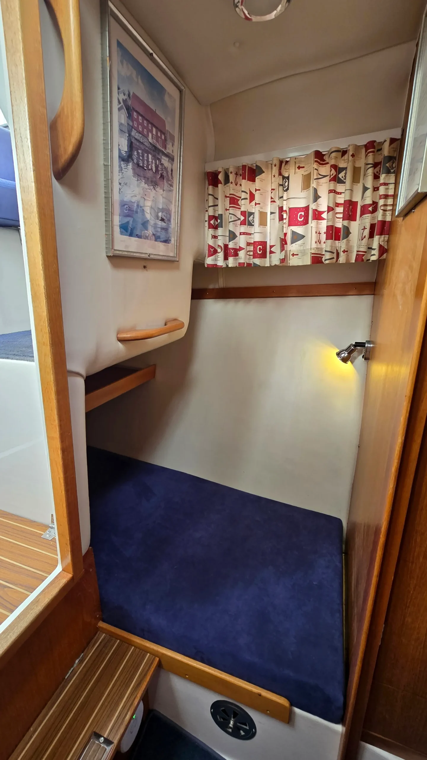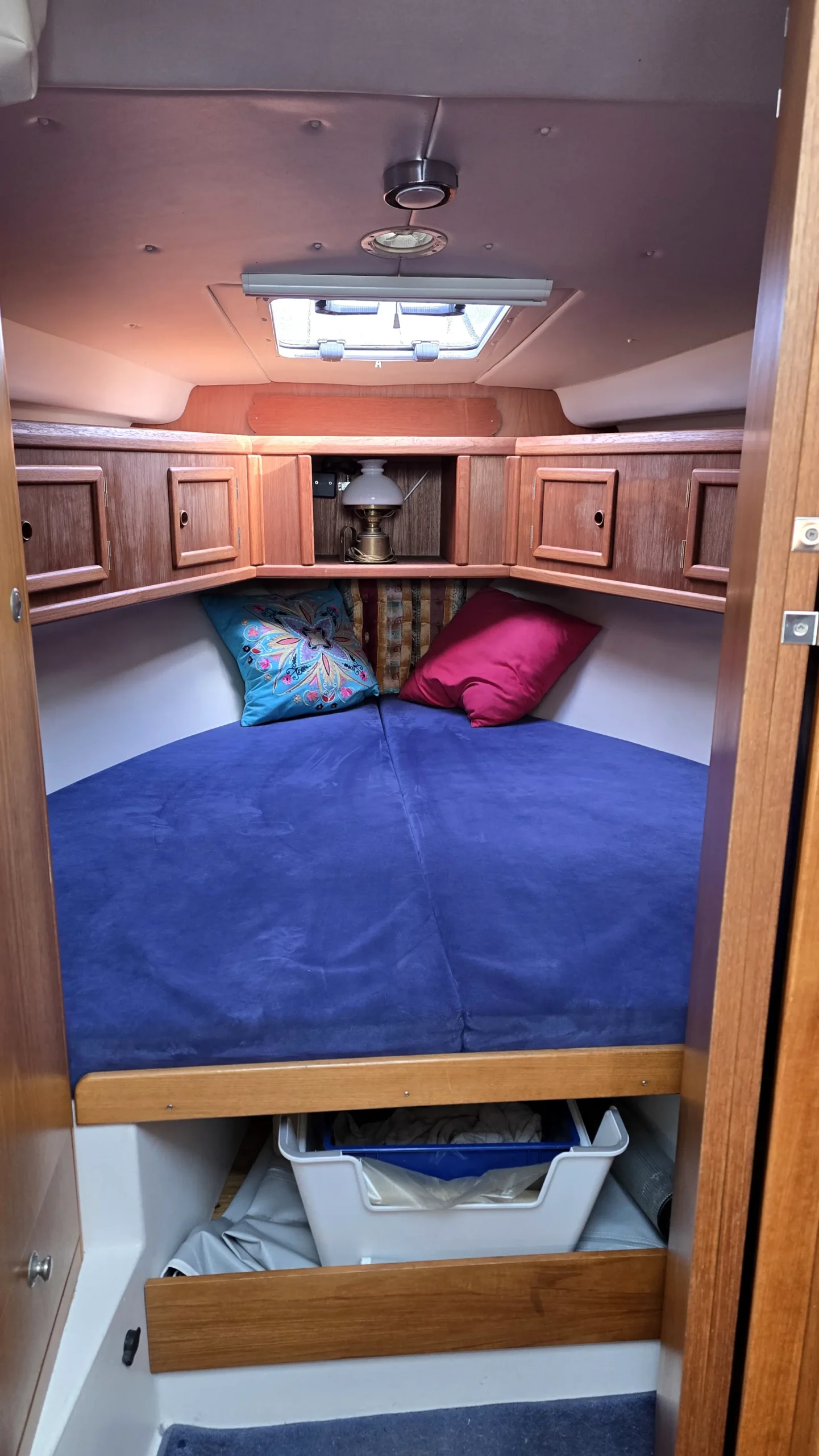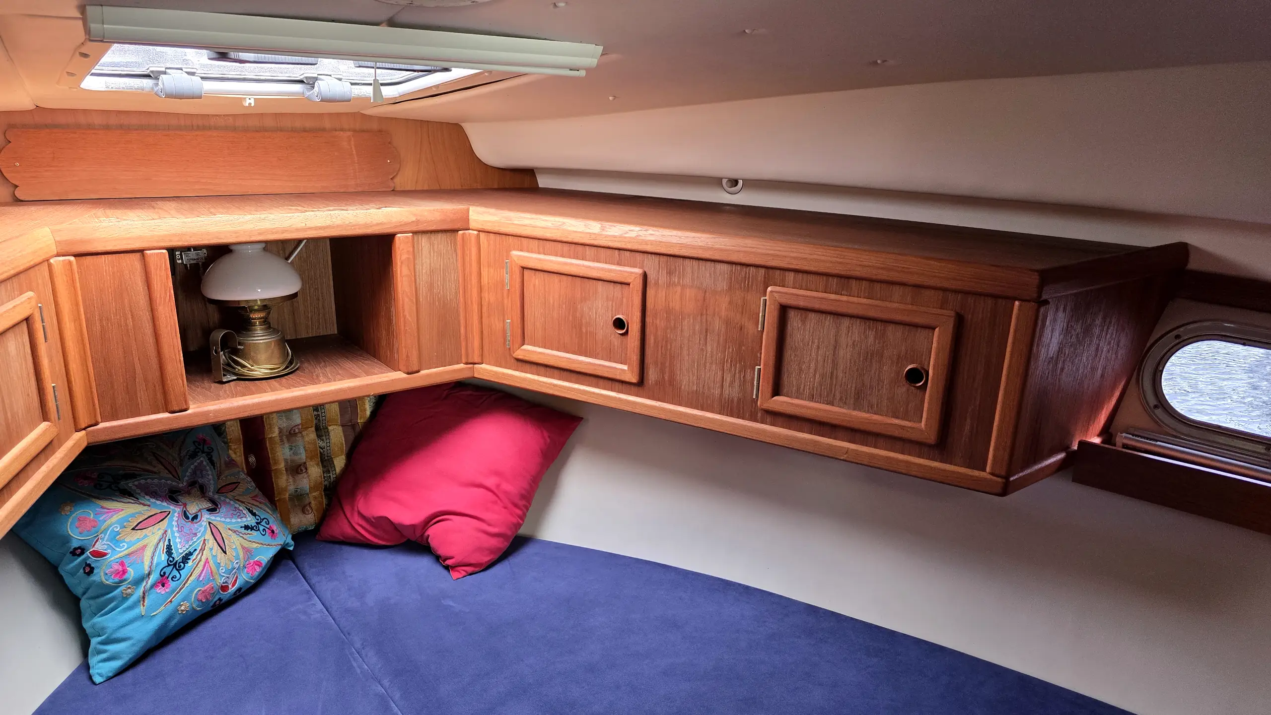 Når dagen nærmer sig slutningen, er der 2 sovepladser i snuden af båden samt en enkelt i stikkøjen i bagbord side. Har man brug for mere, kan sofagruppen i salonnen omdannes til endnu en soveplads.