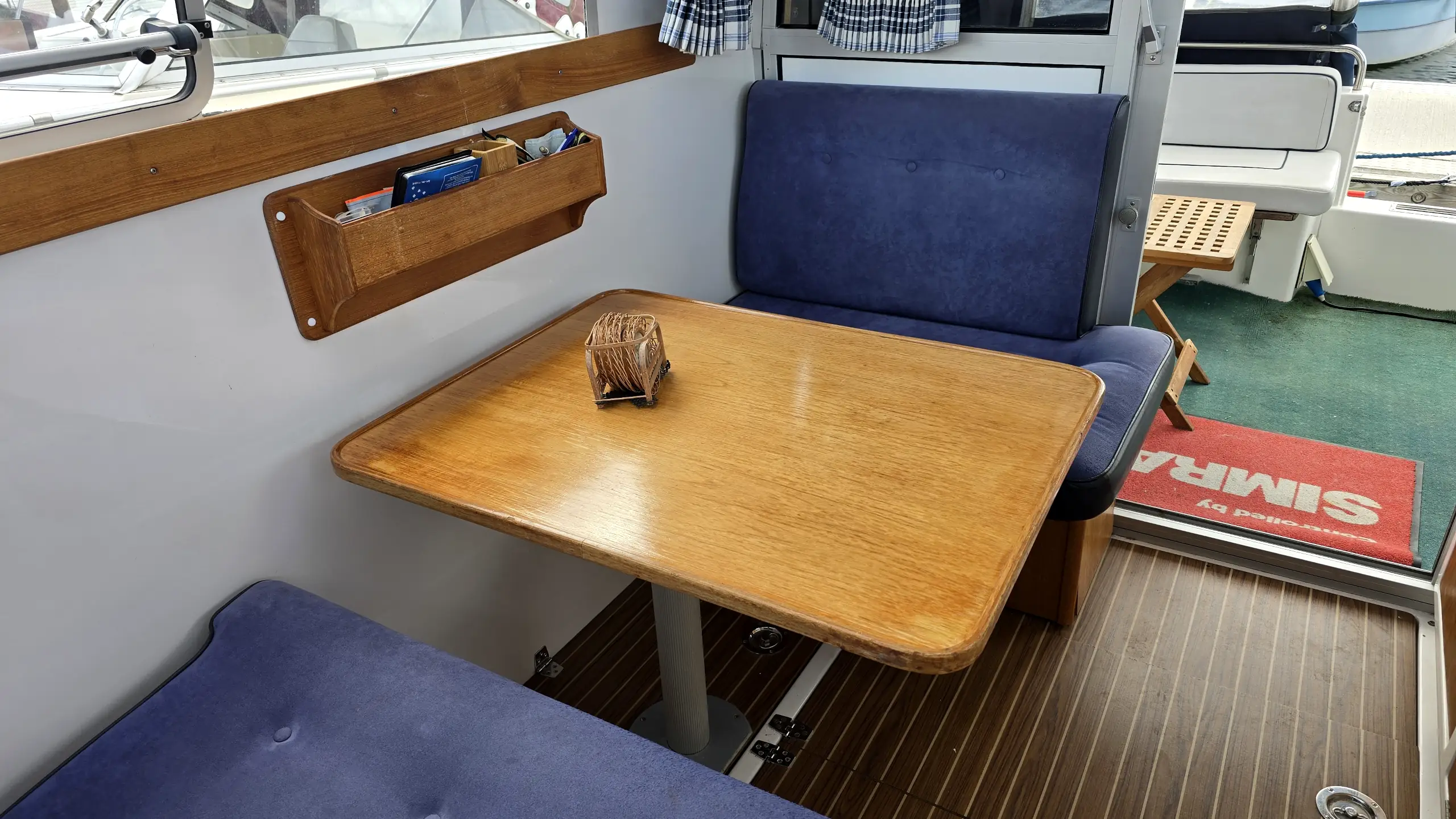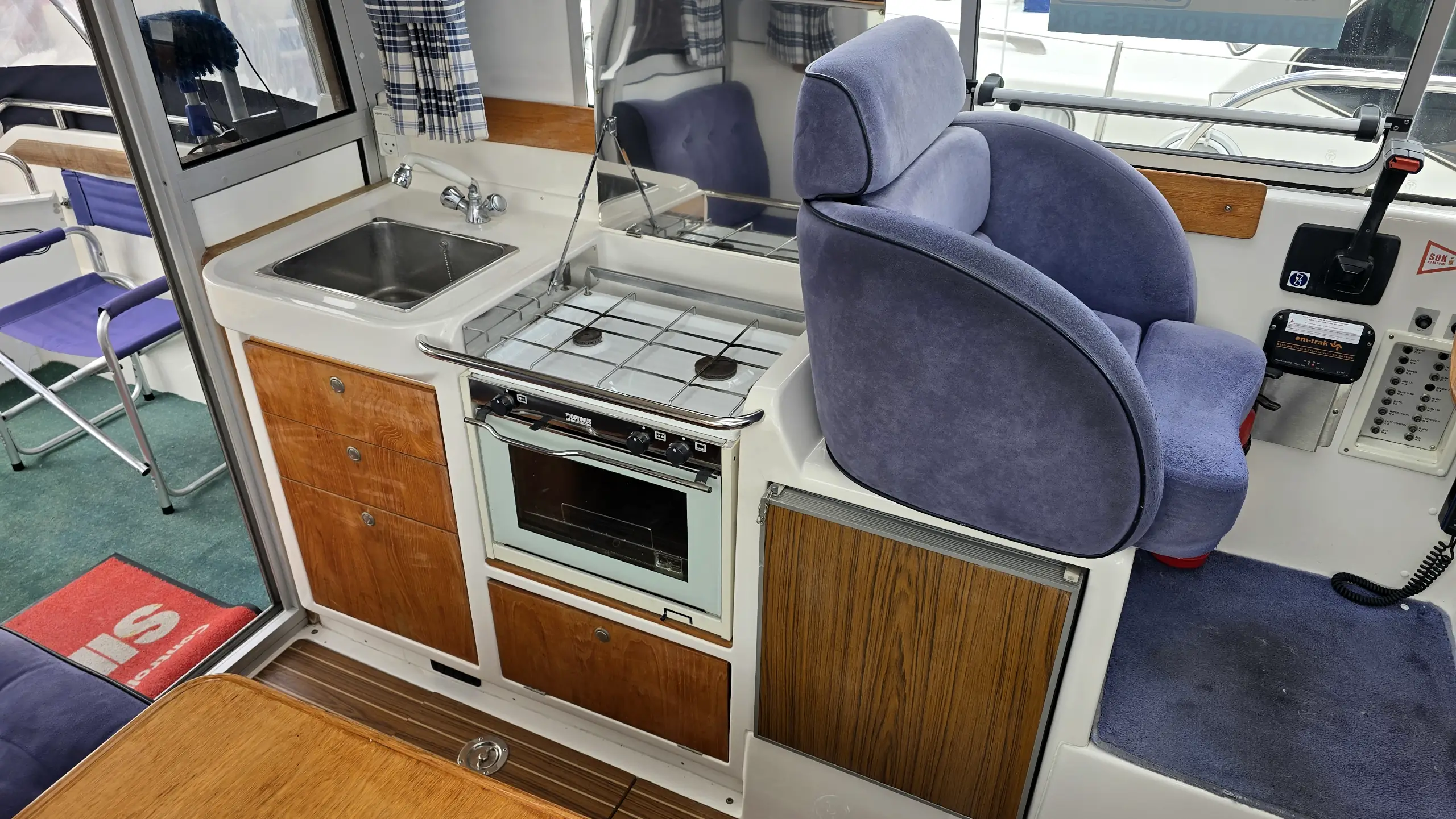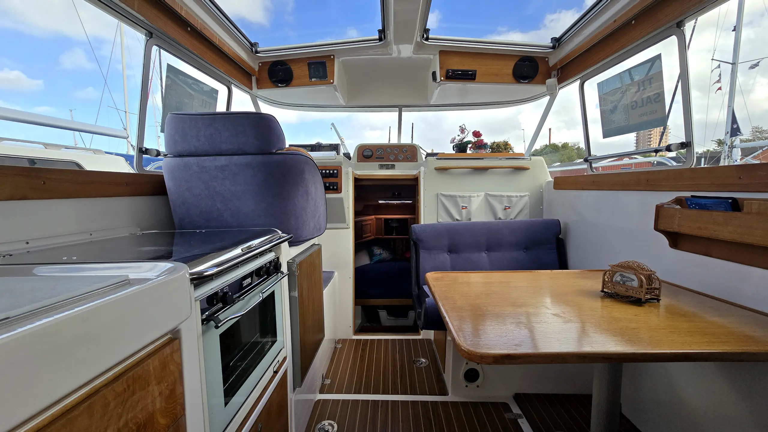 Fra agterdækket fører den faste skydedør os ind I den lyse salon, med køkken i bagbord side, samt siddeområde i styrbord side. Køkkennet byder på bade varmt og koldt vand, køleskab, gaskomfur med 2 blus samt en gasovn.  Ethvert måltid eller kaffe nydes med god udsigt i alle retninger samt god ventilation takket være de store luger i loftet, som kan skydes åben og lade en masse luft ind, uden man mærker vinden. Er det ikke nok kan begge sidevinduer ligeledes skydes åben for maksimal gennemtræk.