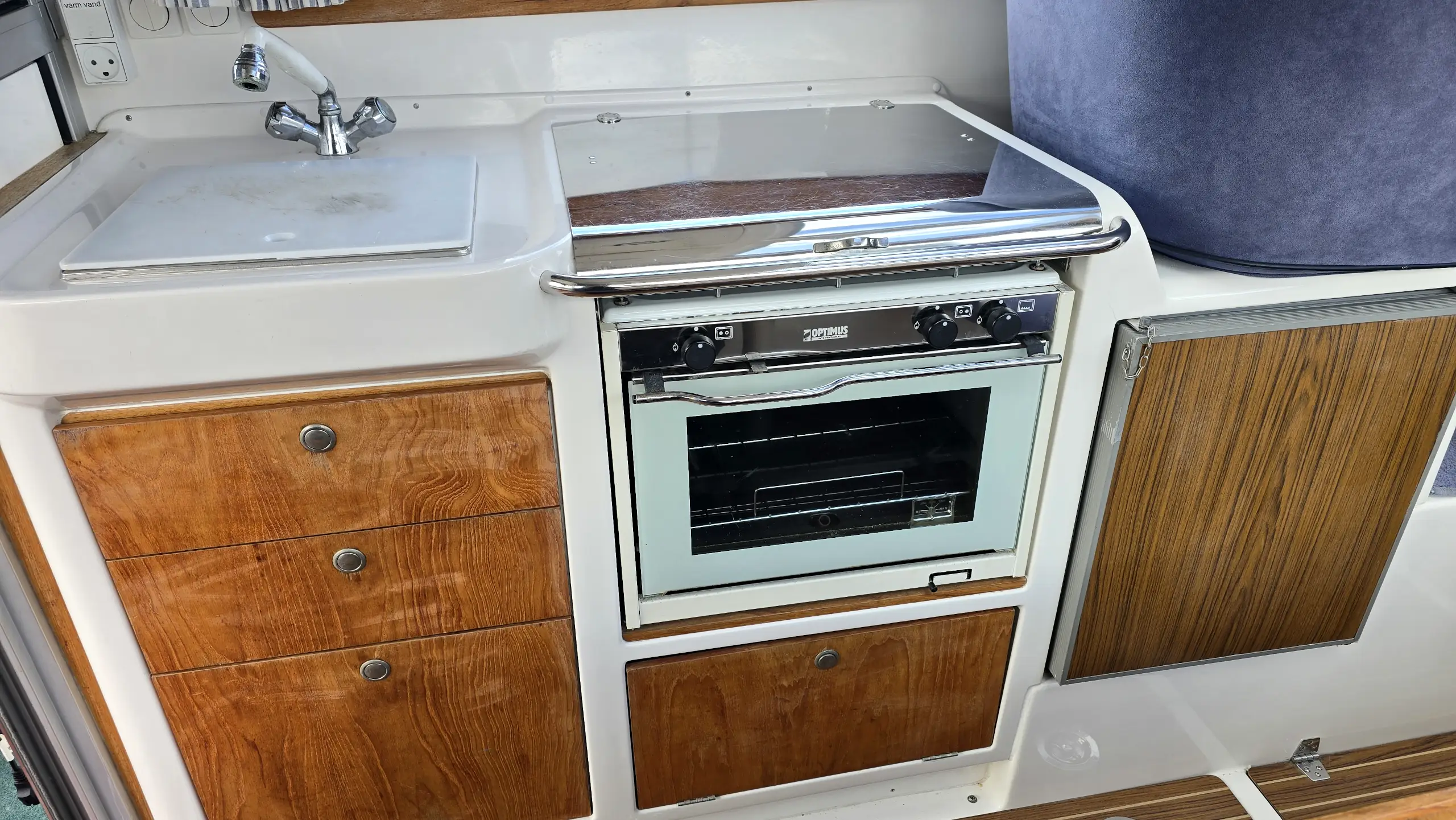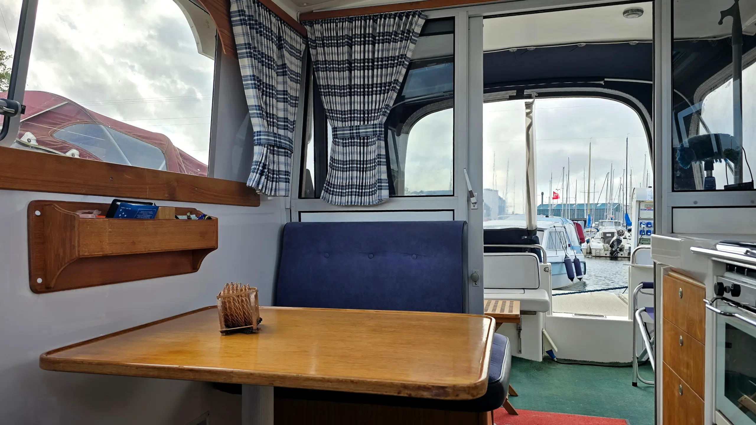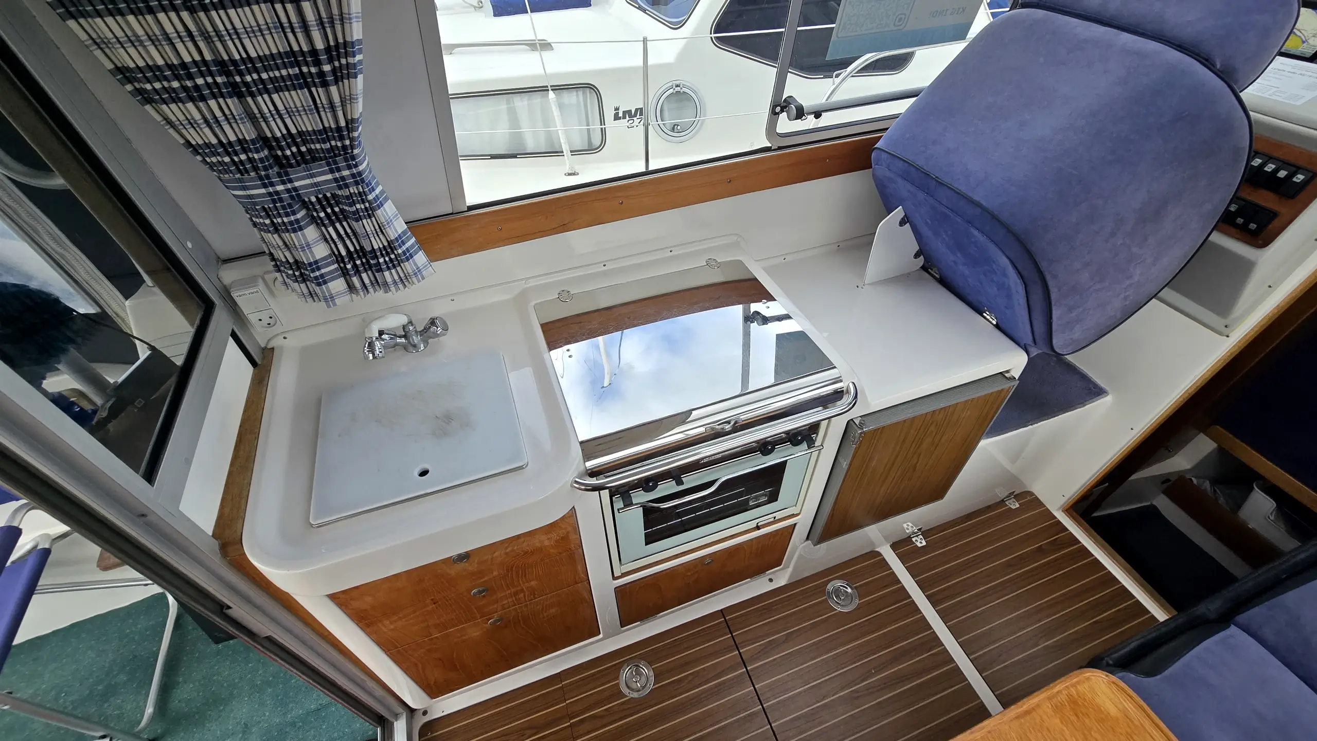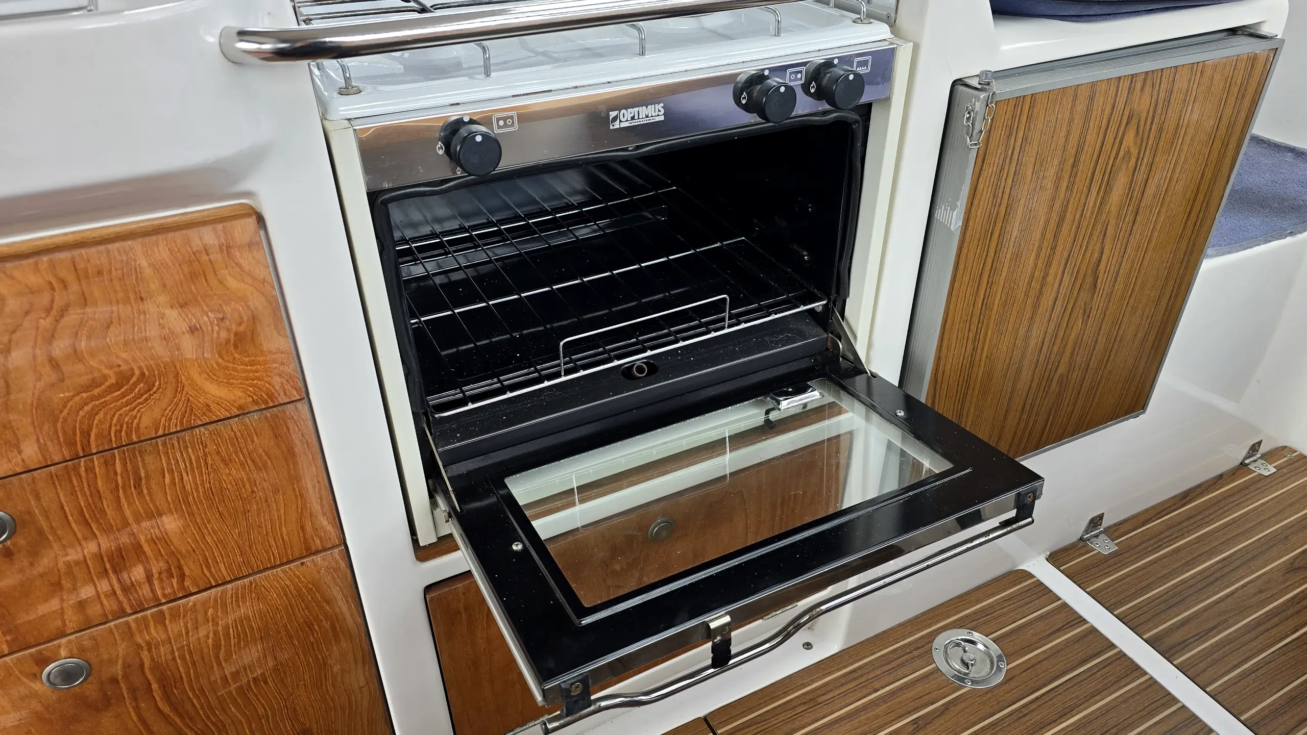 Fra agterdækket fører den faste skydedør os ind I den lyse salon, med køkken i bagbord side, samt siddeområde i styrbord side. Køkkennet byder på bade varmt og koldt vand, køleskab, gaskomfur med 2 blus samt en gasovn.  Ethvert måltid eller kaffe nydes med god udsigt i alle retninger samt god ventilation takket være de store luger i loftet, som kan skydes åben og lade en masse luft ind, uden man mærker vinden. Er det ikke nok kan begge sidevinduer ligeledes skydes åben for maksimal gennemtræk.